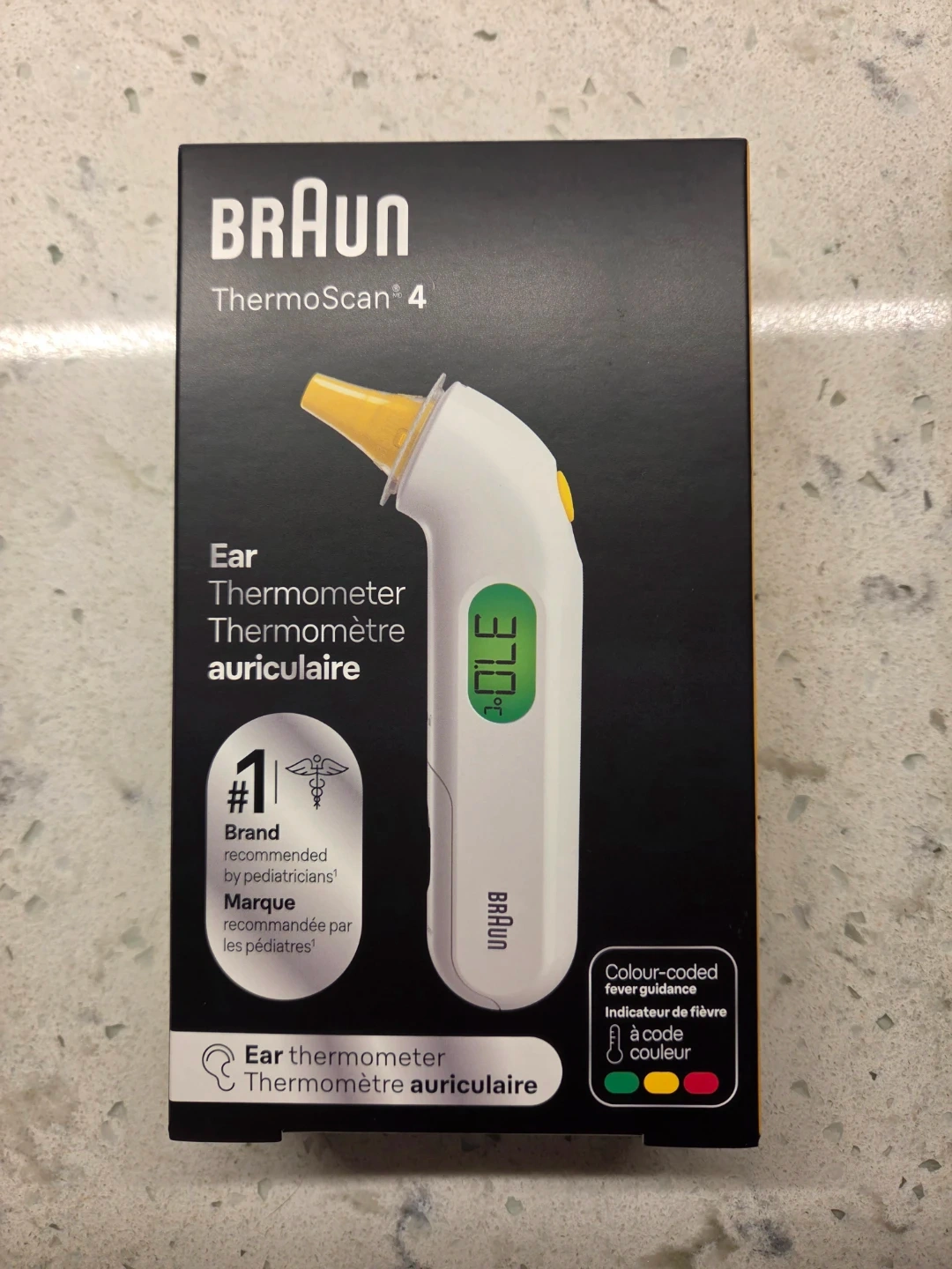 This is a Braun ThermoScan 4 ear thermometer. It offers colour-coded fever guidance. It's the #1 brand recommended by pediatricians.