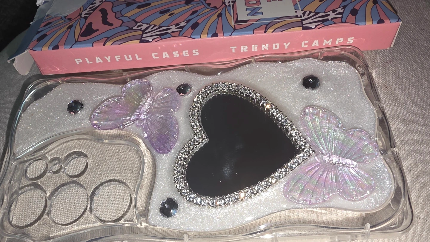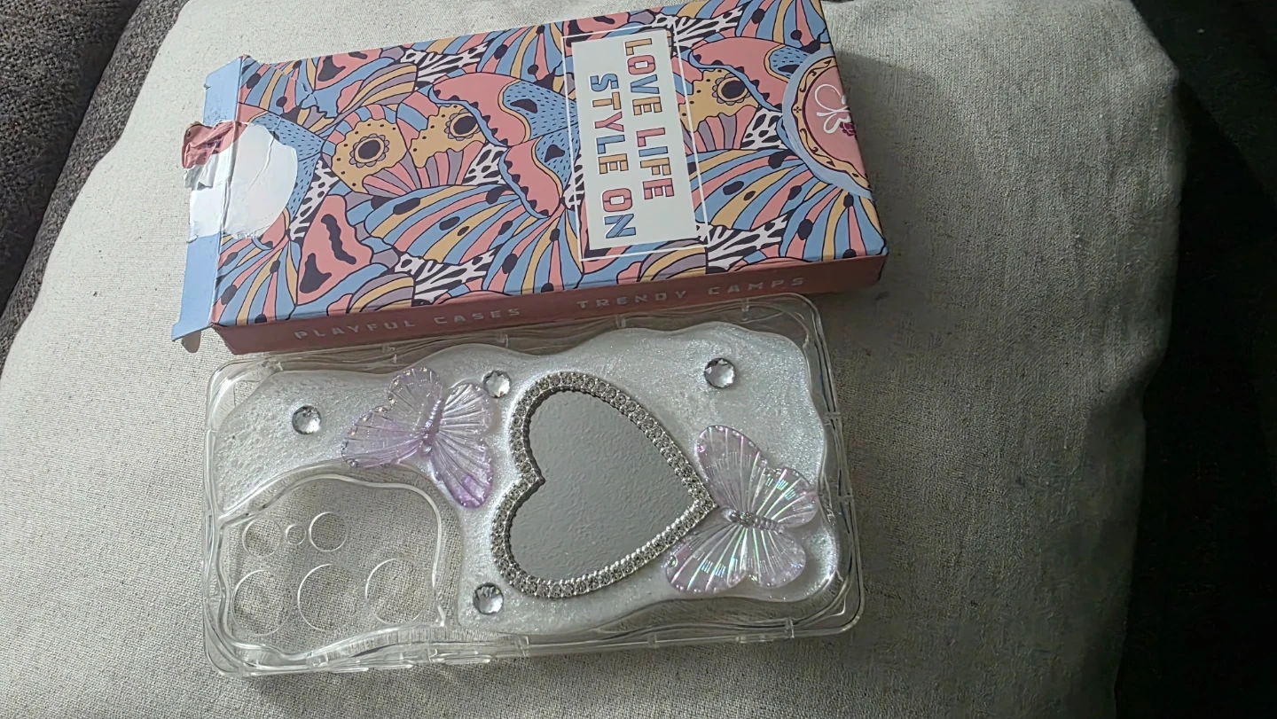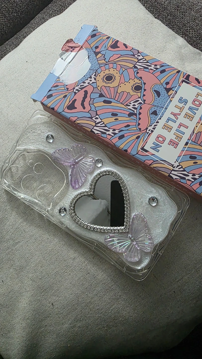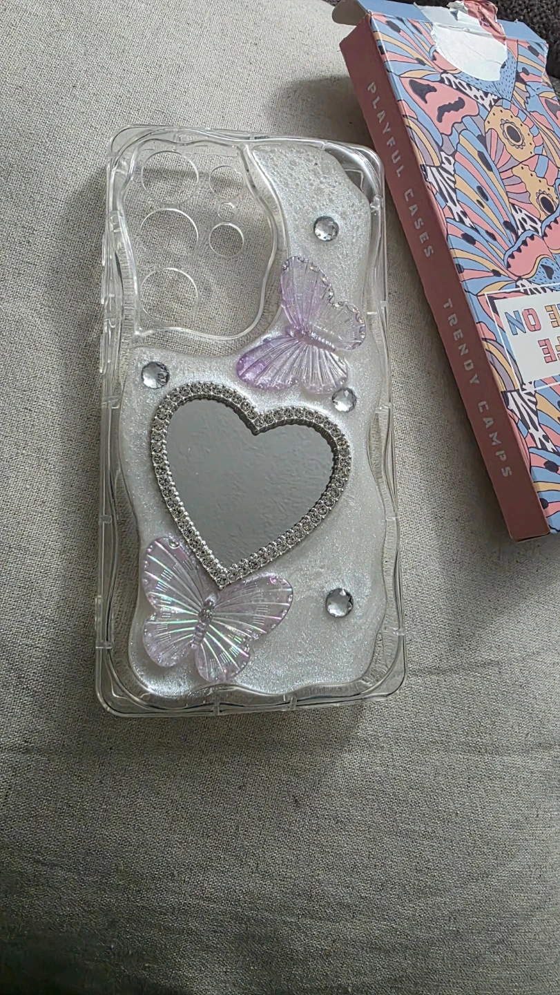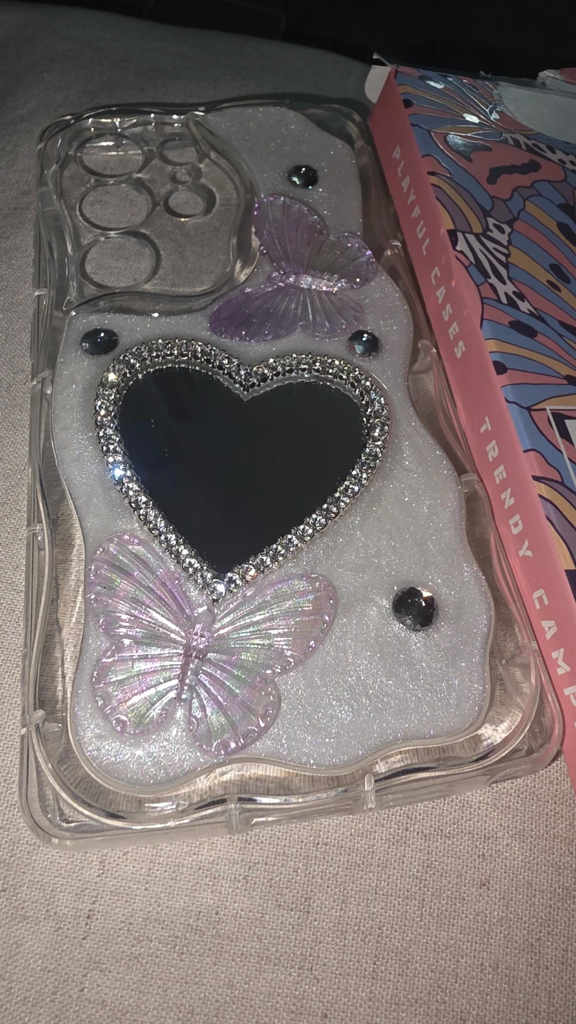 This case is designed for the Samsung S24 Ultra and features a heart-shaped mirror with butterfly and rhinestone accents. It's made of clear plastic with a sparkly overlay. The box is also included.