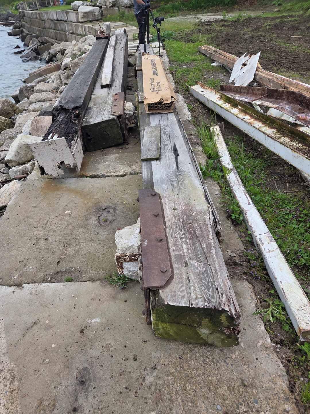 Recovered antique wooden beams and metal supports. Show significant wear and weathering. Ideal for restoration projects or unique home decor. Sold as is.
