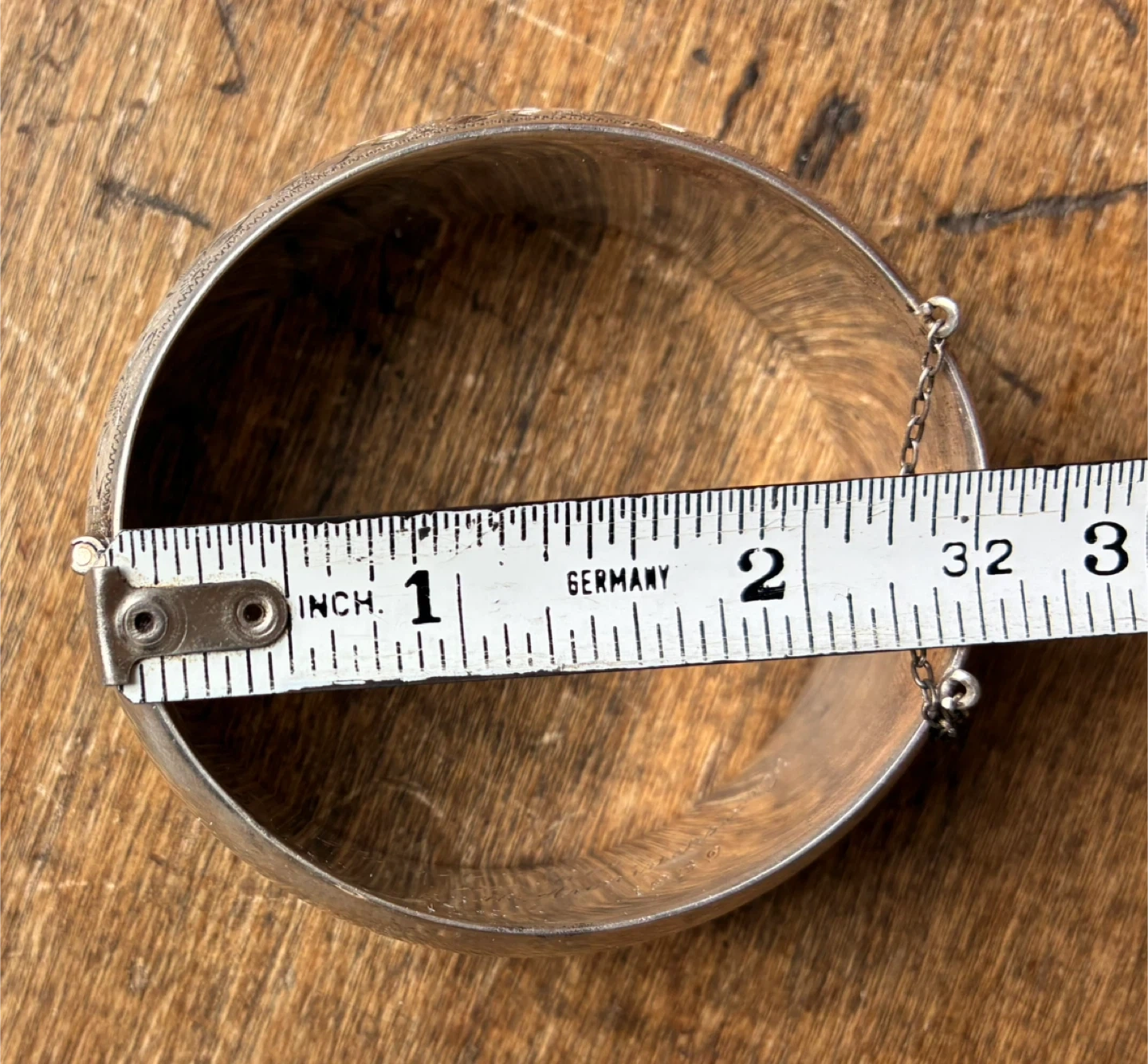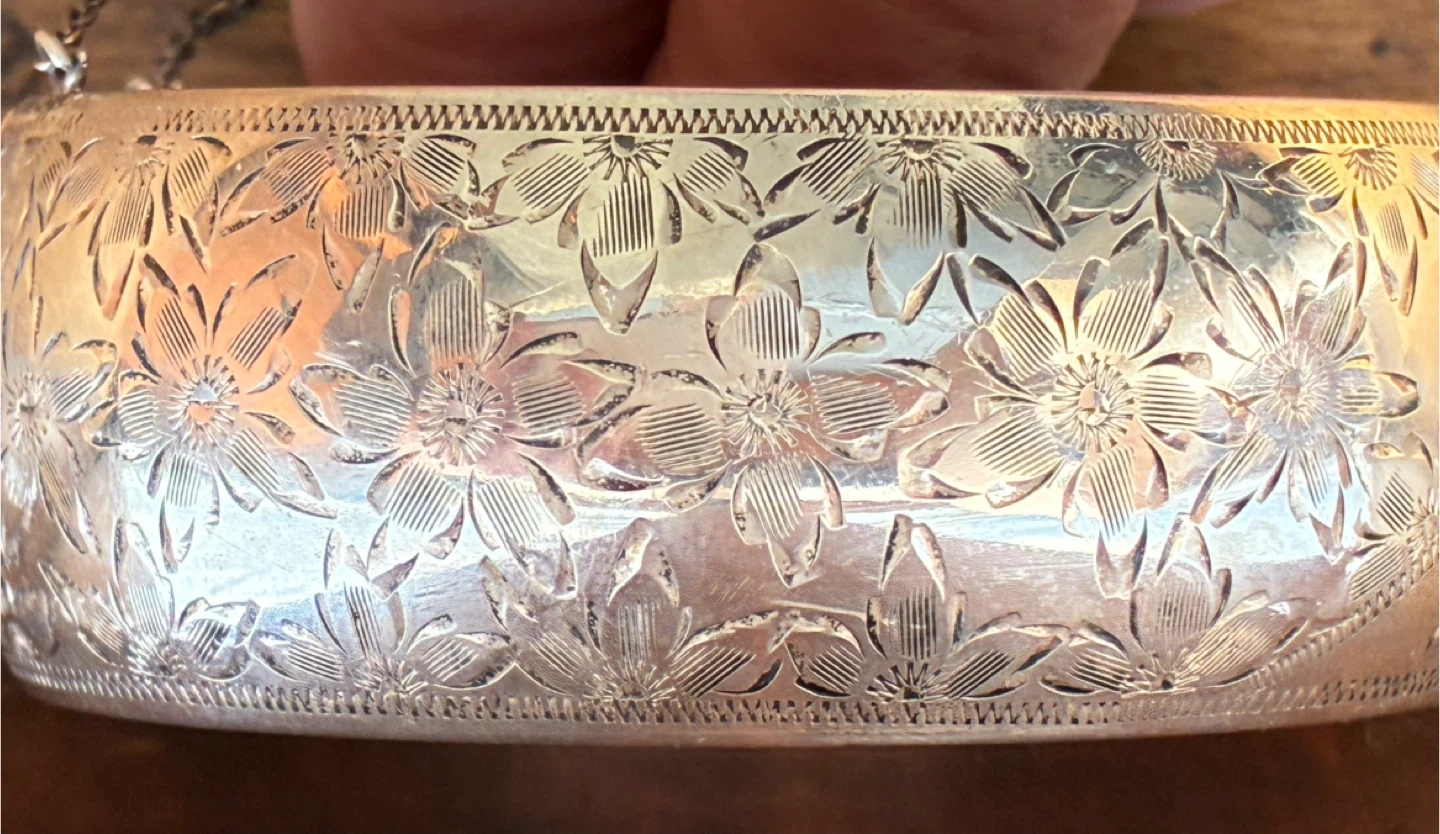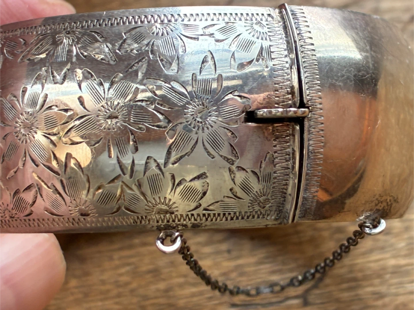 Vintage Sterling floral engraved Silver Hinged bangle bracelet with safety chain