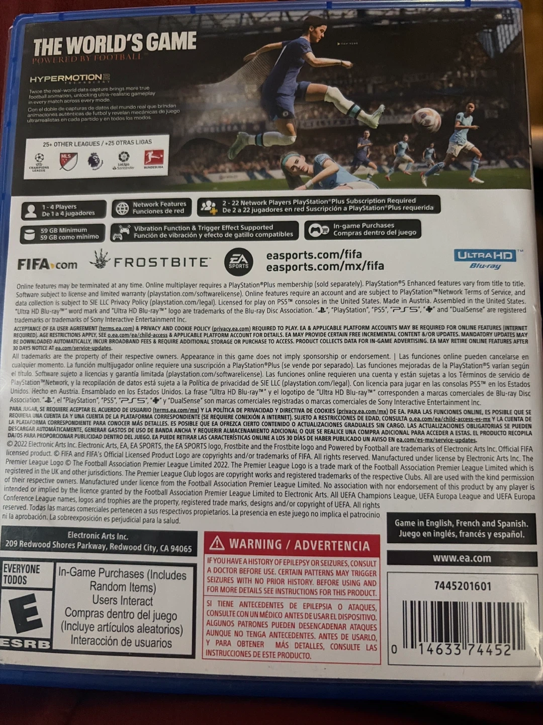 This is the EA Sports FIFA 23 game for PlayStation 5. Features hypermotion technology and ultimate team. Includes multiplayer support for up to 4 players. It's in English and French.