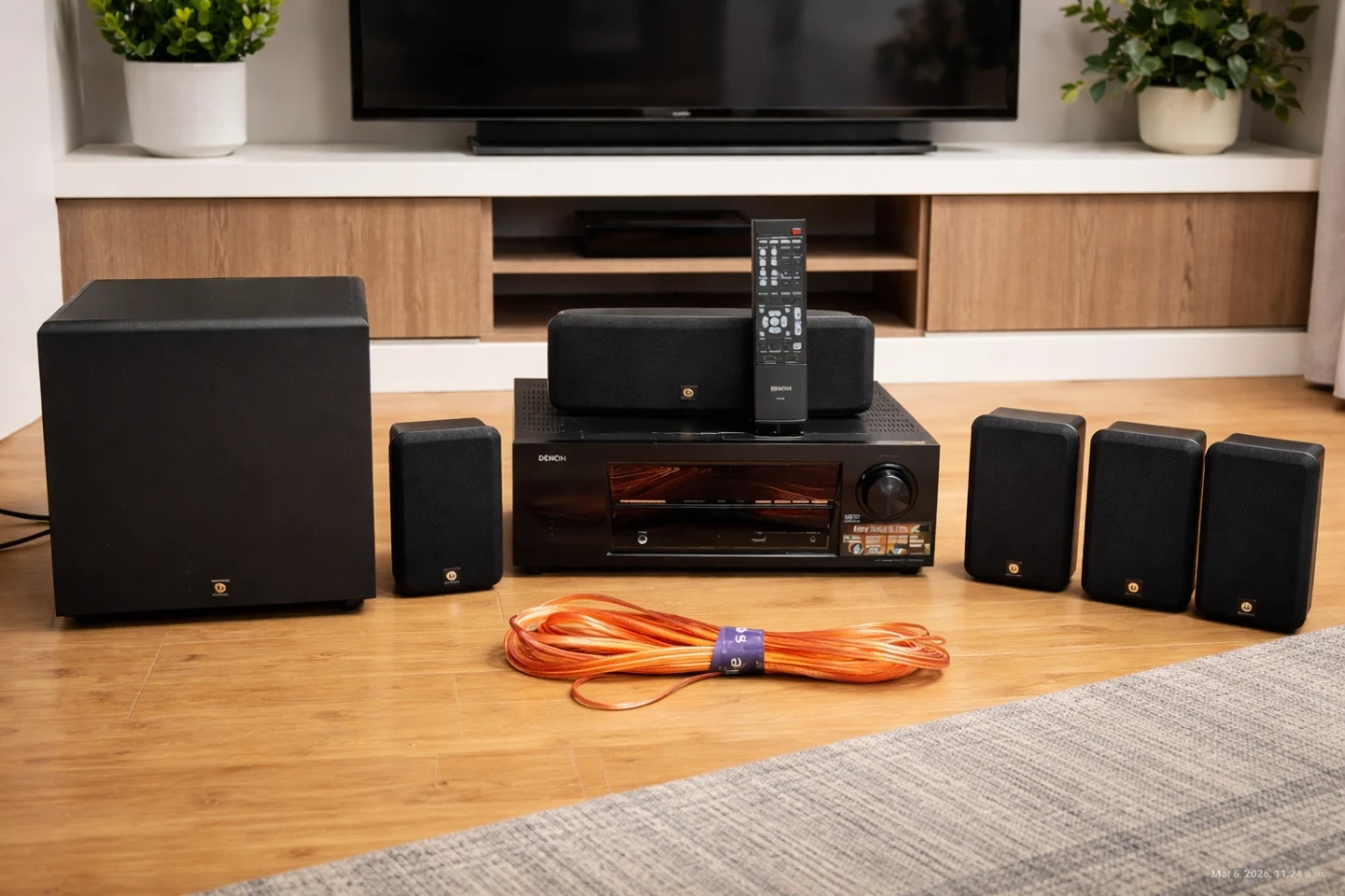 Complete Denon home theatre surround sound system in great working condition.