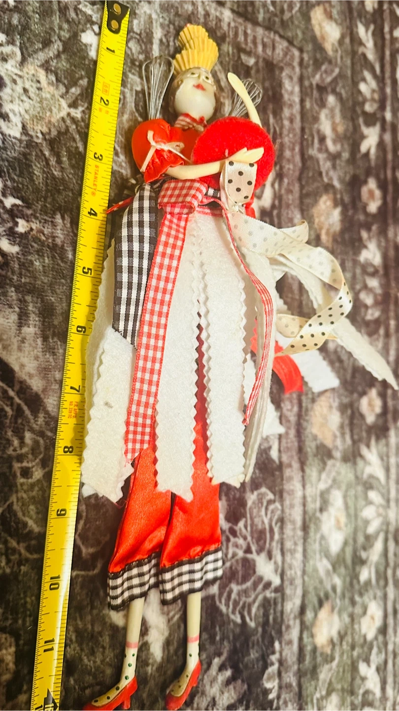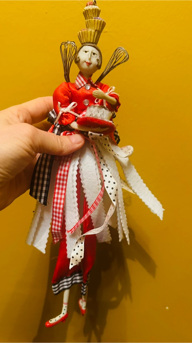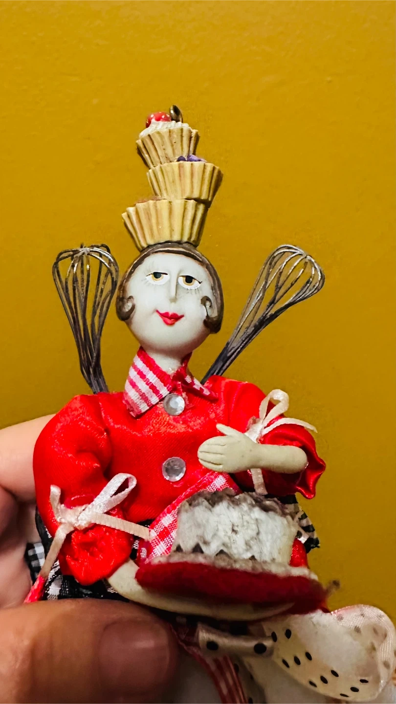 This is a unique chef figurine with whisk wings. It has a stack of cupcakes on its head and is holding a cake. The figurine is wearing a red jacket and white apron. It is a fun and whimsical piece!