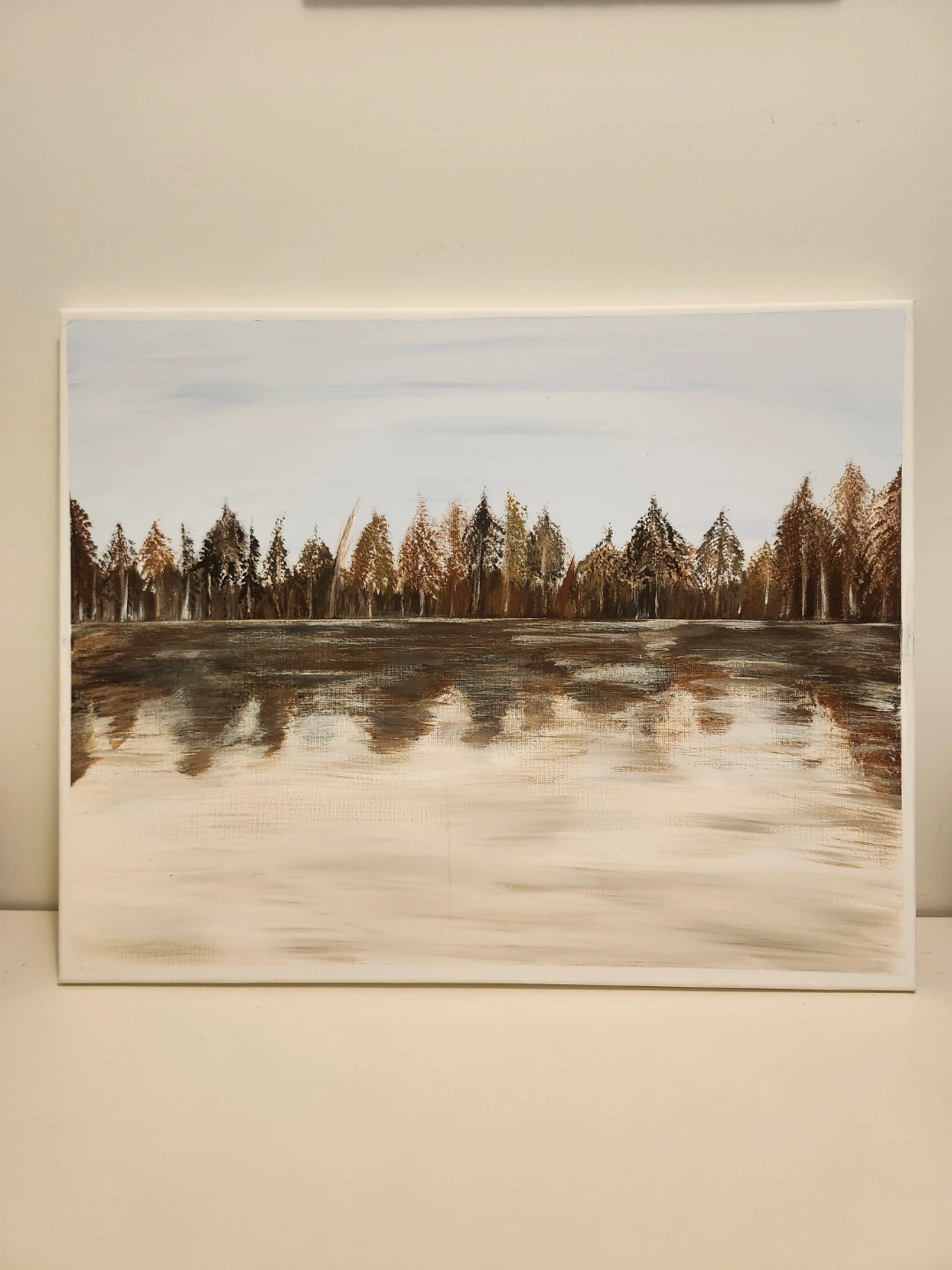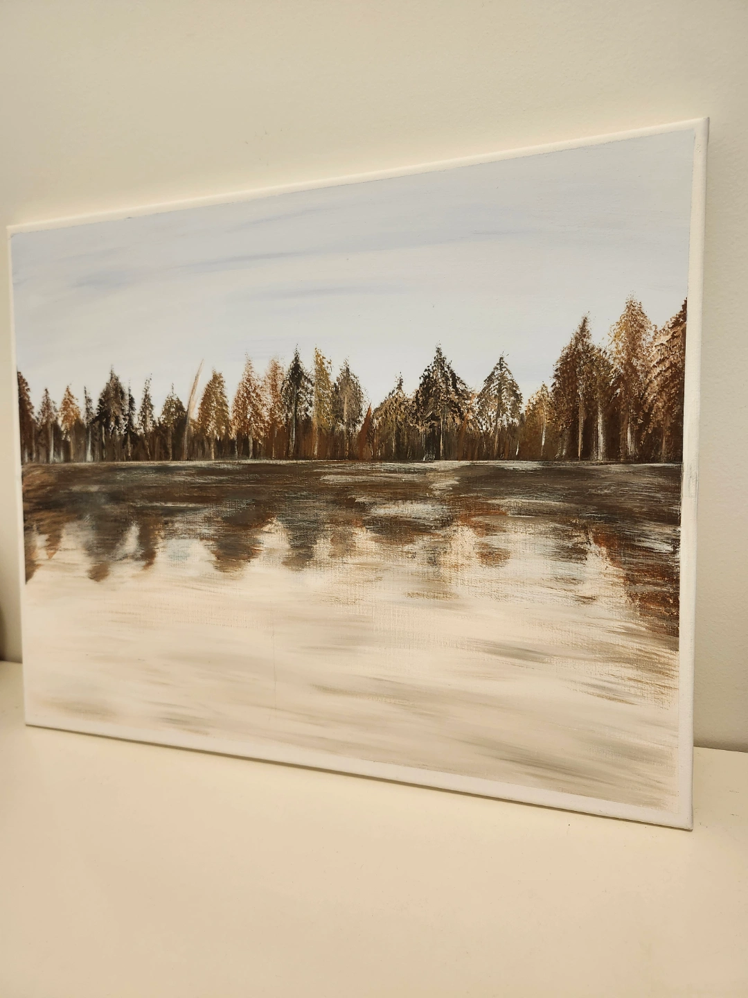 Original painting on canvas. Depicts a forest reflected in a body of water. Neutral colours. Beautiful decor piece for your home.