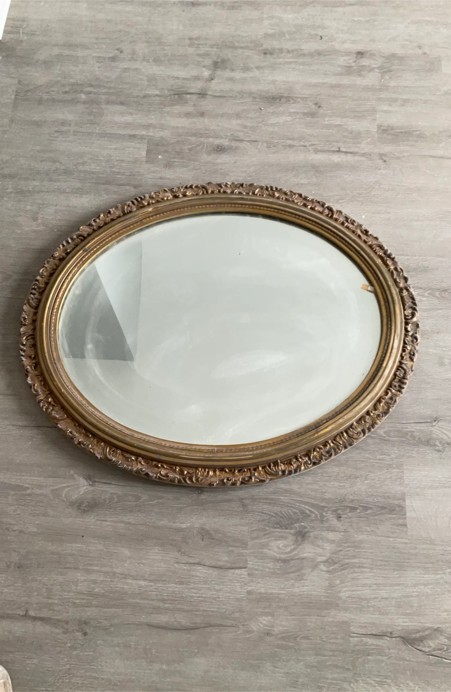 This is an oval wall mirror with an ornate, gold-tone frame. The frame has intricate carvings. It's a lovely accent piece for any room!