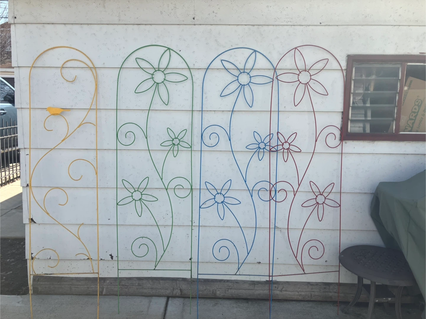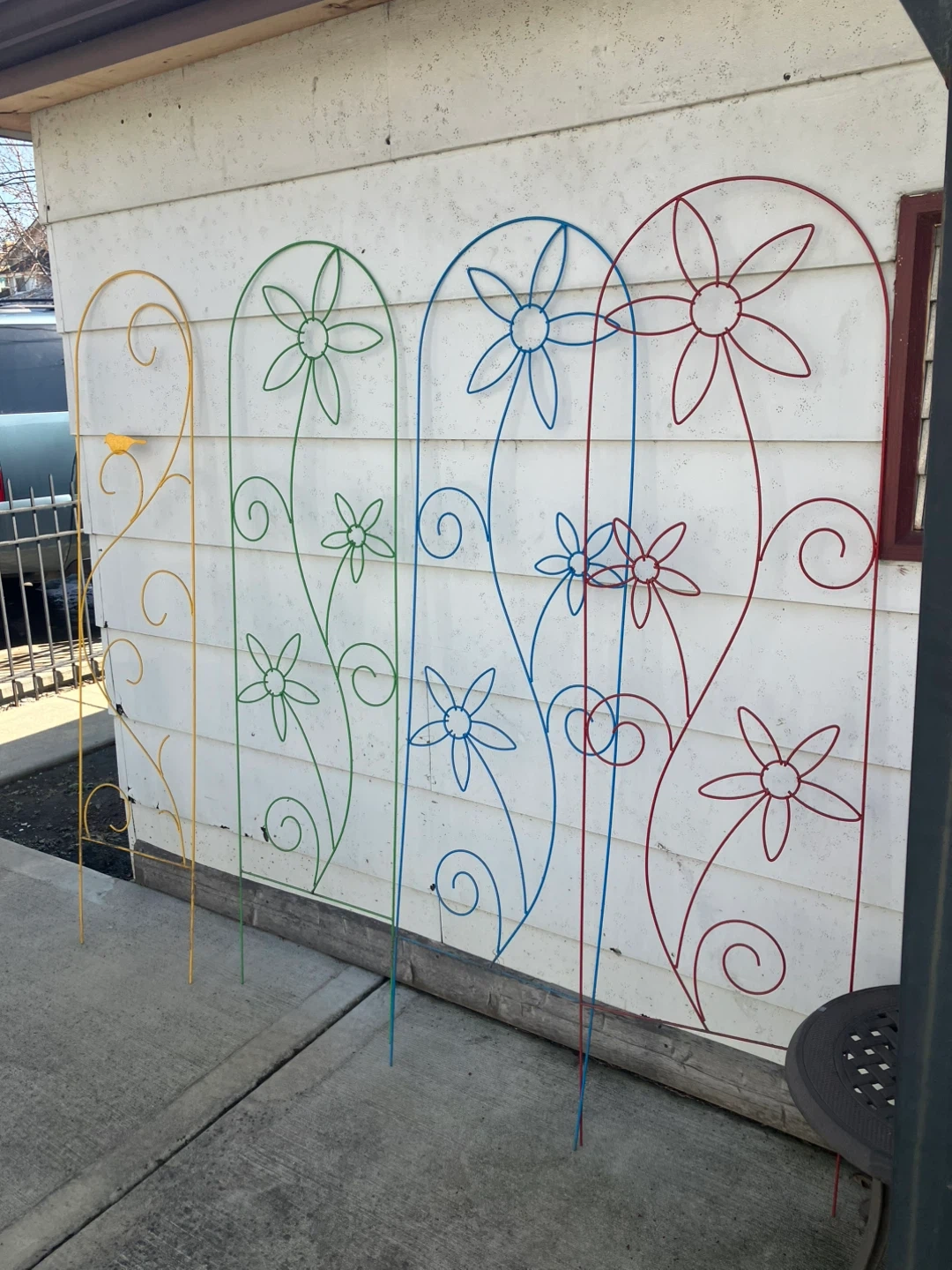 Set of four decorative garden trellises designed for climbing plants or veggies. Each trellis features a floral motif and comes in a different color: yellow, green, blue, and red. These stakes help support plant growth and add visual appeal to your garden. They're great for vining flowers or small vegetable plants.