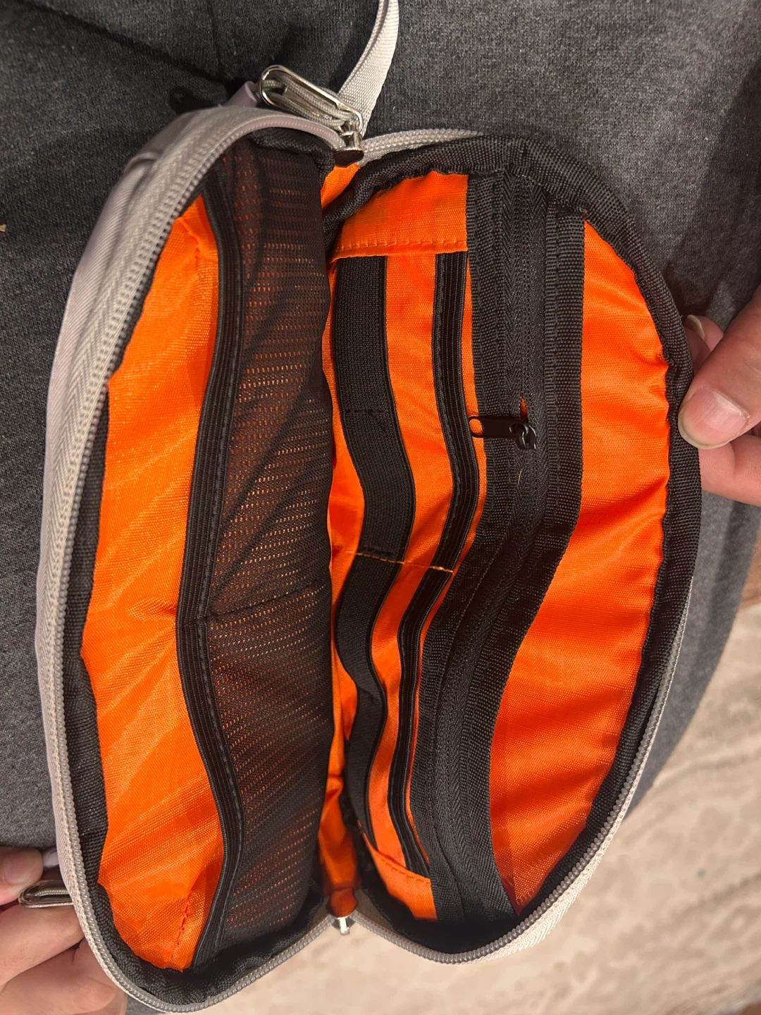 This is a handy pouch bag with a light grey exterior and a bright orange interior. It features multiple zippered compartments and pockets inside for organization. The bag has a wrist strap for easy carrying.