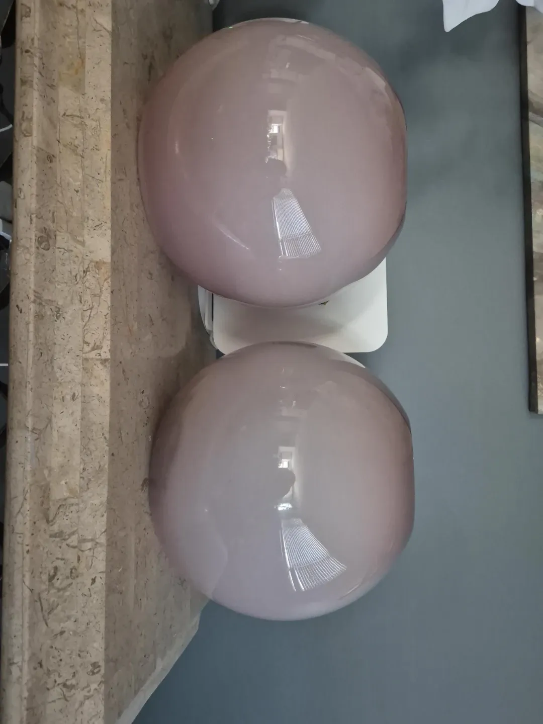 Two decorative spherical glass lamps with a pinkish-gray hue. These would make a lovely addition to any room, providing ambient lighting. Glass material.