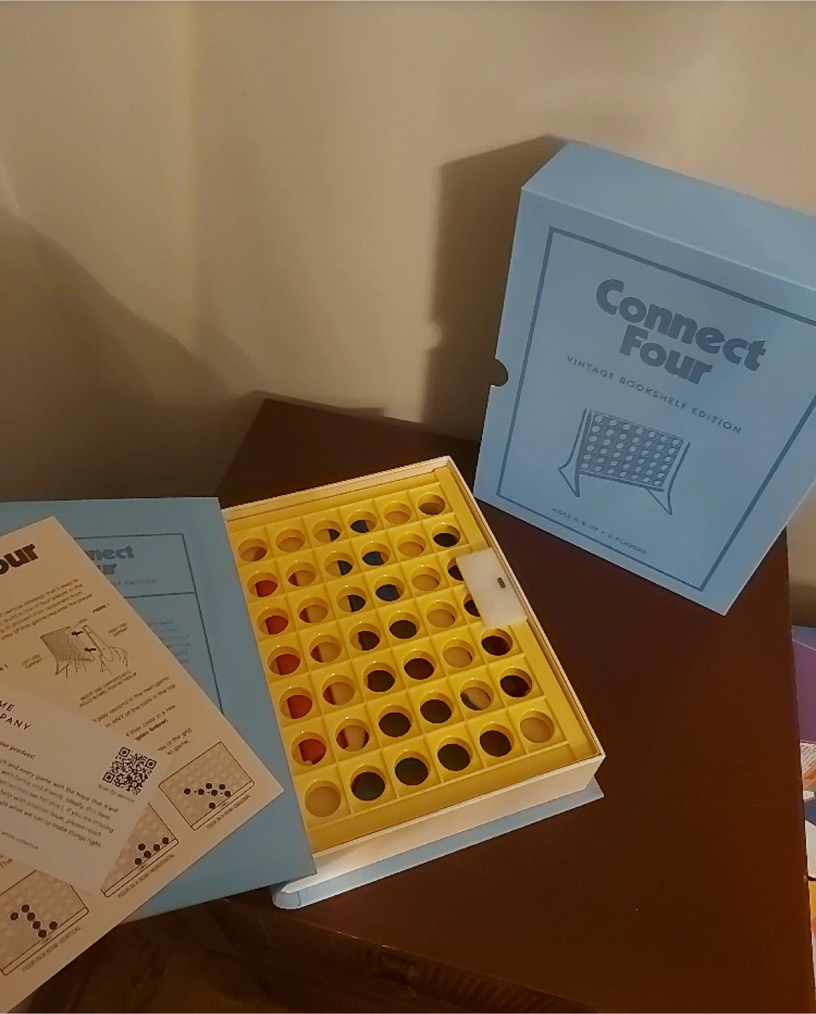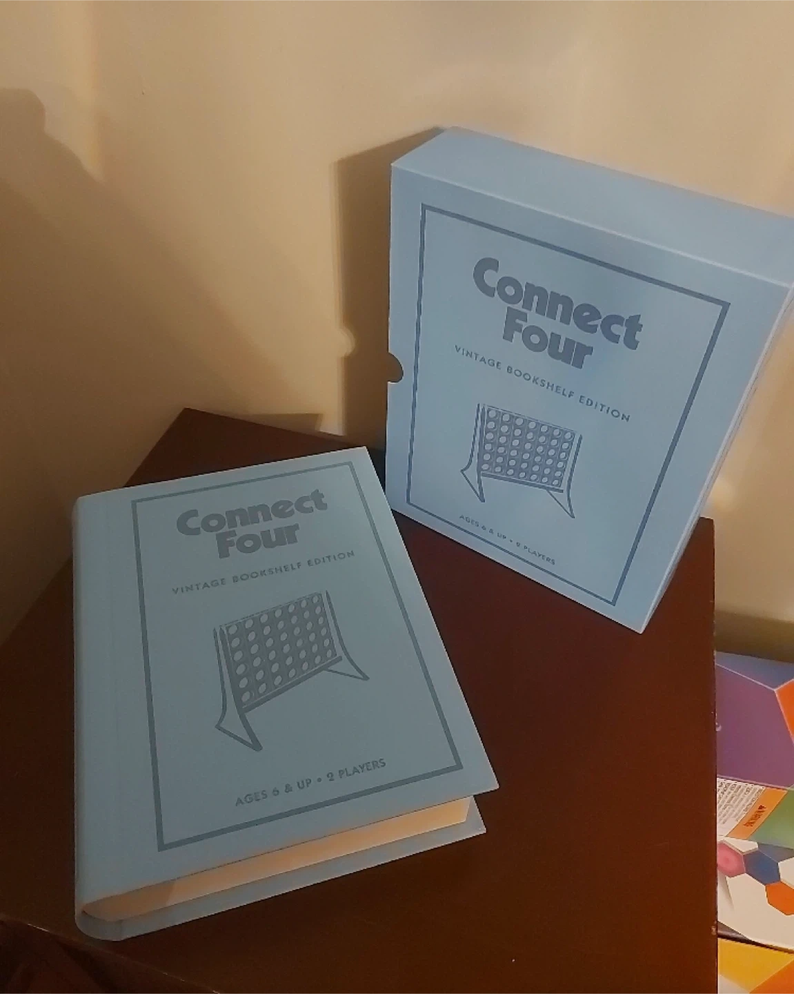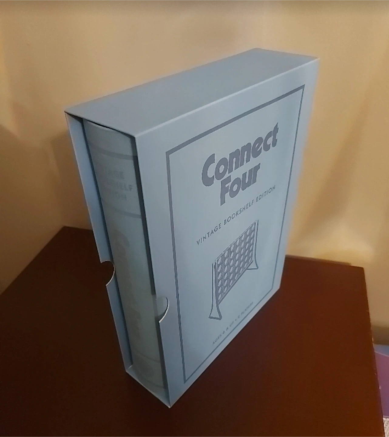 This is the Connect Four Vintage Bookshelf Edition board game. It's designed for 2 players and recommended for ages 6 and up. The game includes all the pieces for a fun experience.