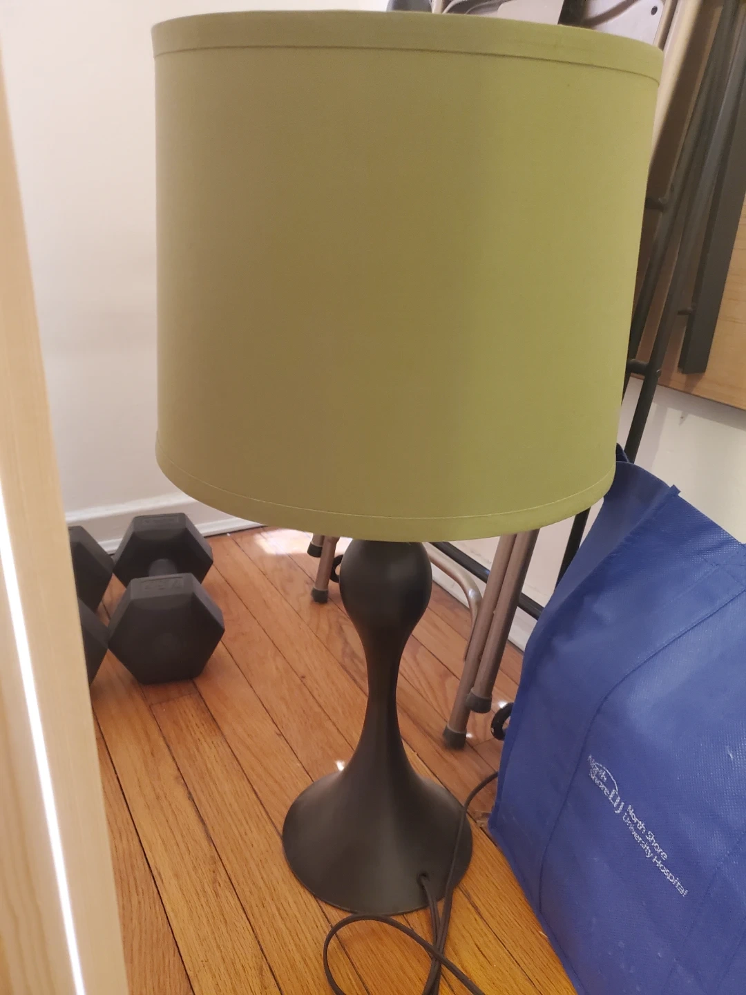 This is a table lamp with a green fabric lampshade. It has a dark-colored, decorative base. The lamp is functional and provides ambient lighting.