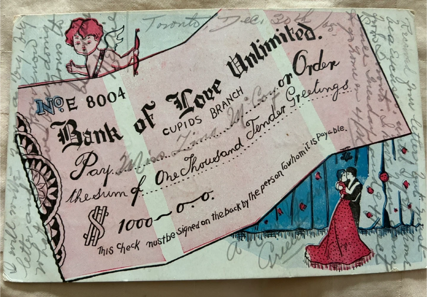 Postcard love vintage Bank of Love Unlimited Cheque funny art