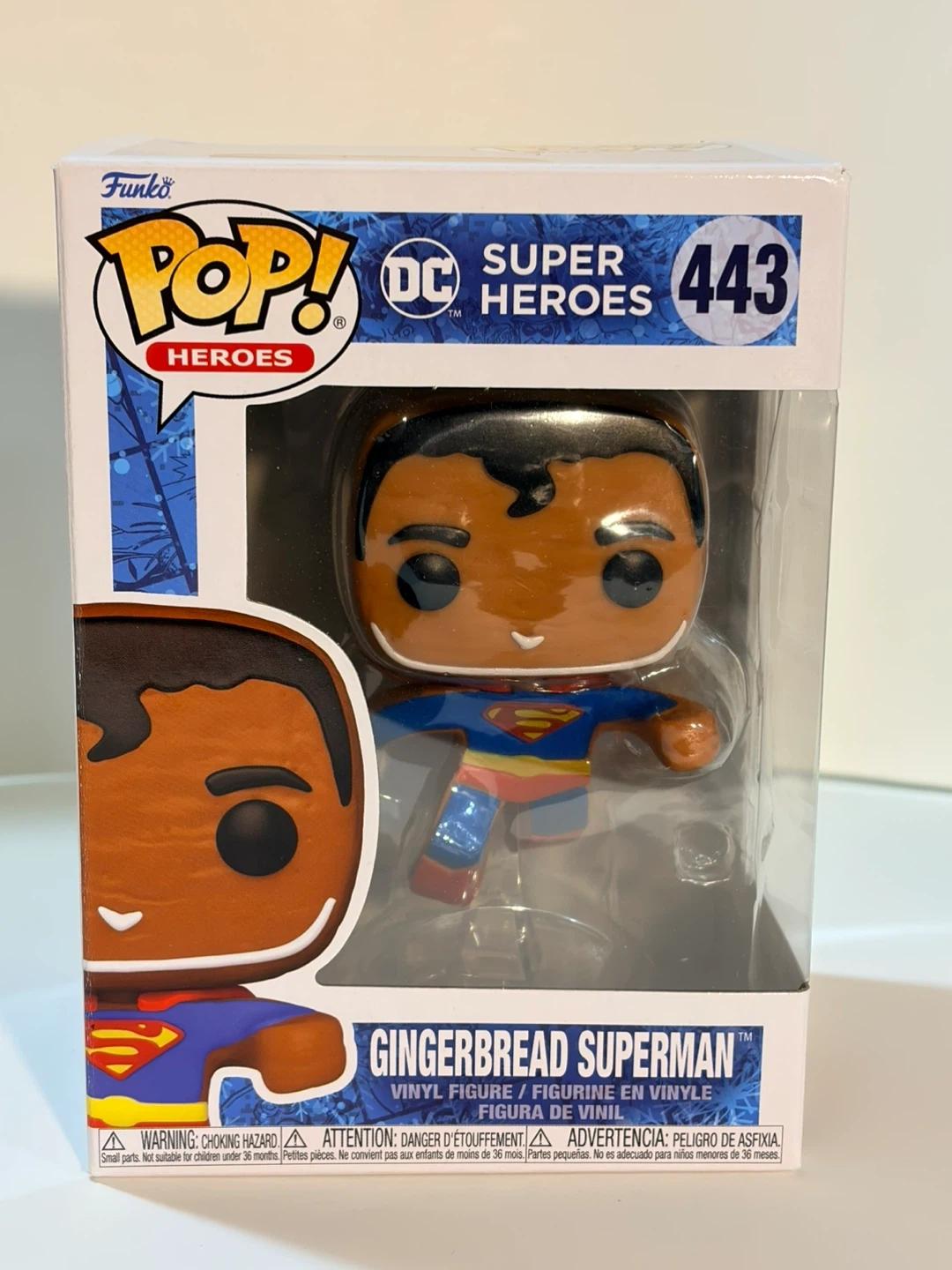 It's a Funko Pop! vinyl figure of Gingerbread Superman, number 443 in the DC Super Heroes line. This collectible features a unique gingerbread-inspired design. Includes original packaging.