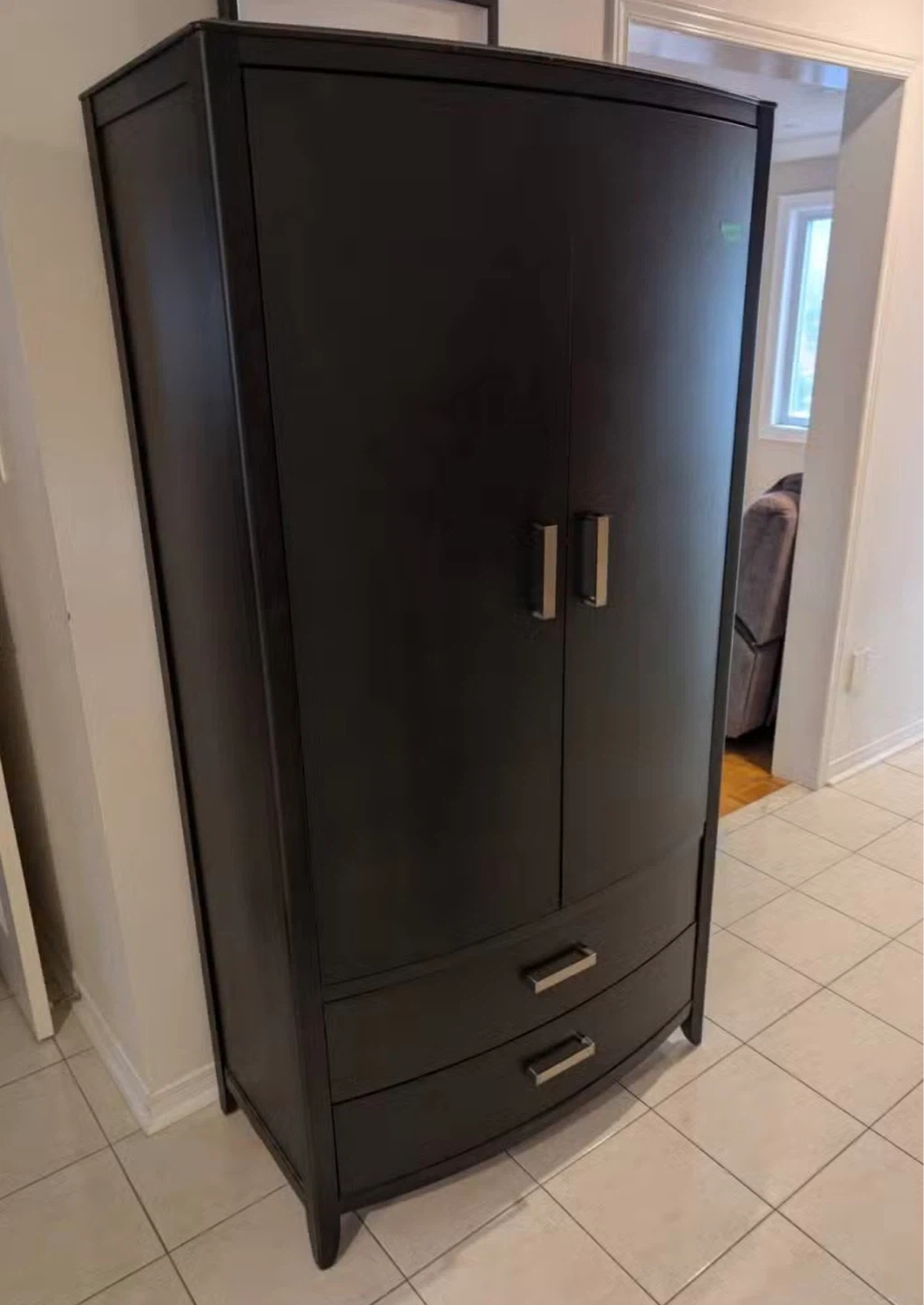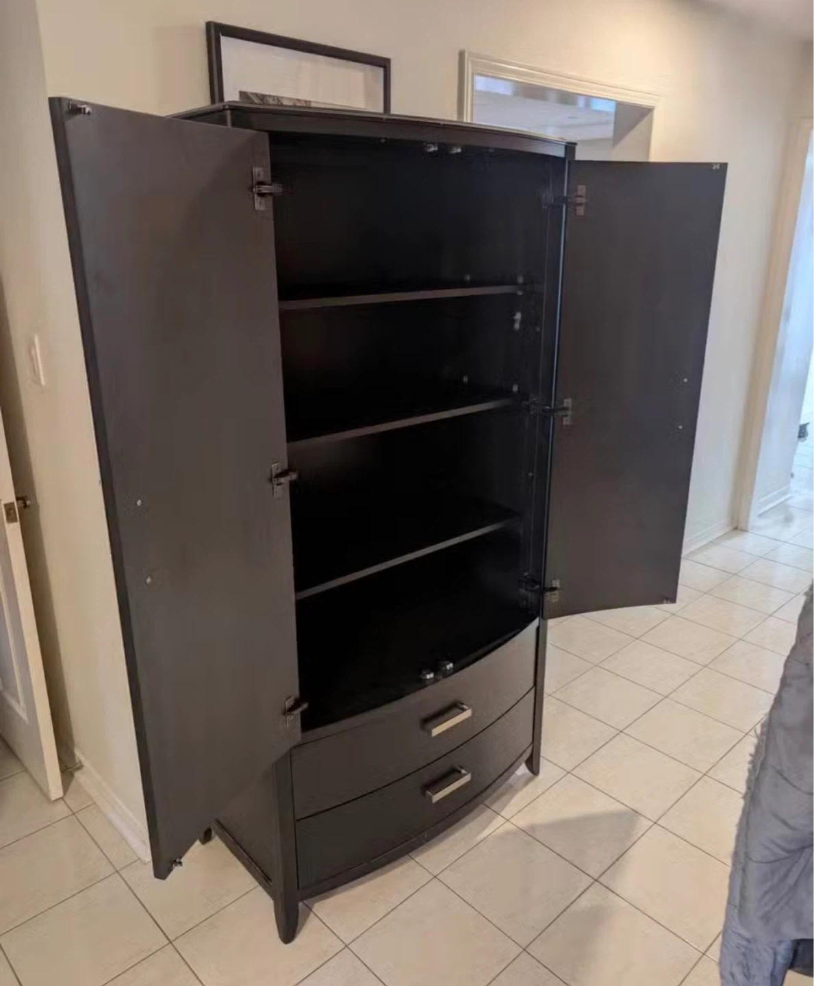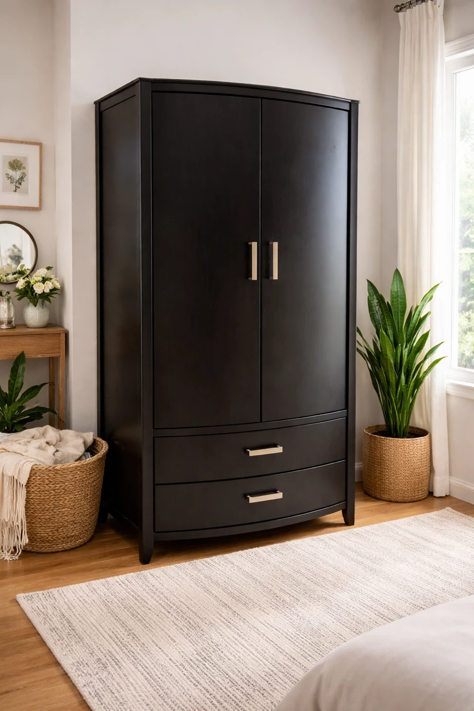 This black armoire wardrobe offers ample storage with two doors and three drawers. It's a stylish and functional piece for any bedroom. Wooden construction.