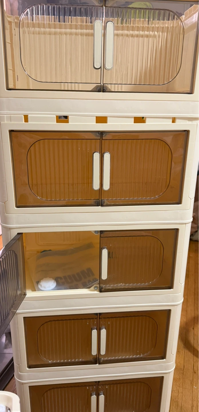 This is a stacking storage cabinet with multiple drawers. It's made of plastic and has a cream exterior with brown translucent doors. Great for organizing clothes or other household items!