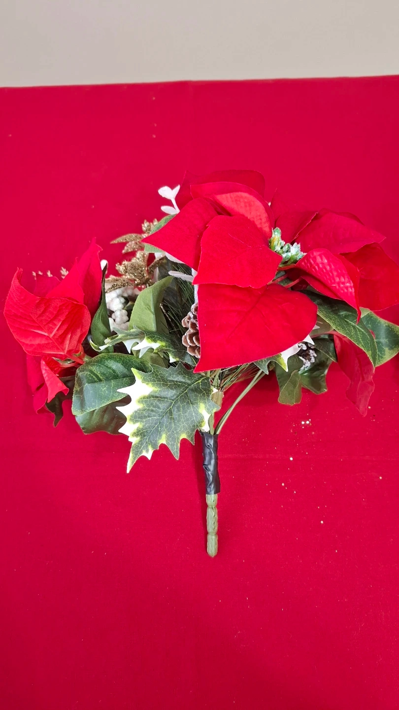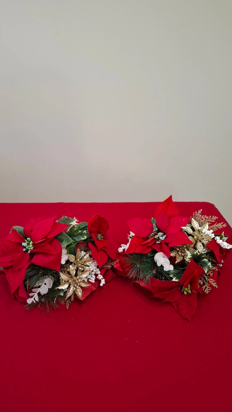 A pair of festive artificial arrangements featuring red poinsettias, glittered gold flowers, and greenery. It's perfect for adding a touch of holiday cheer to your home decor! The arrangement includes pine sprigs and white berries.