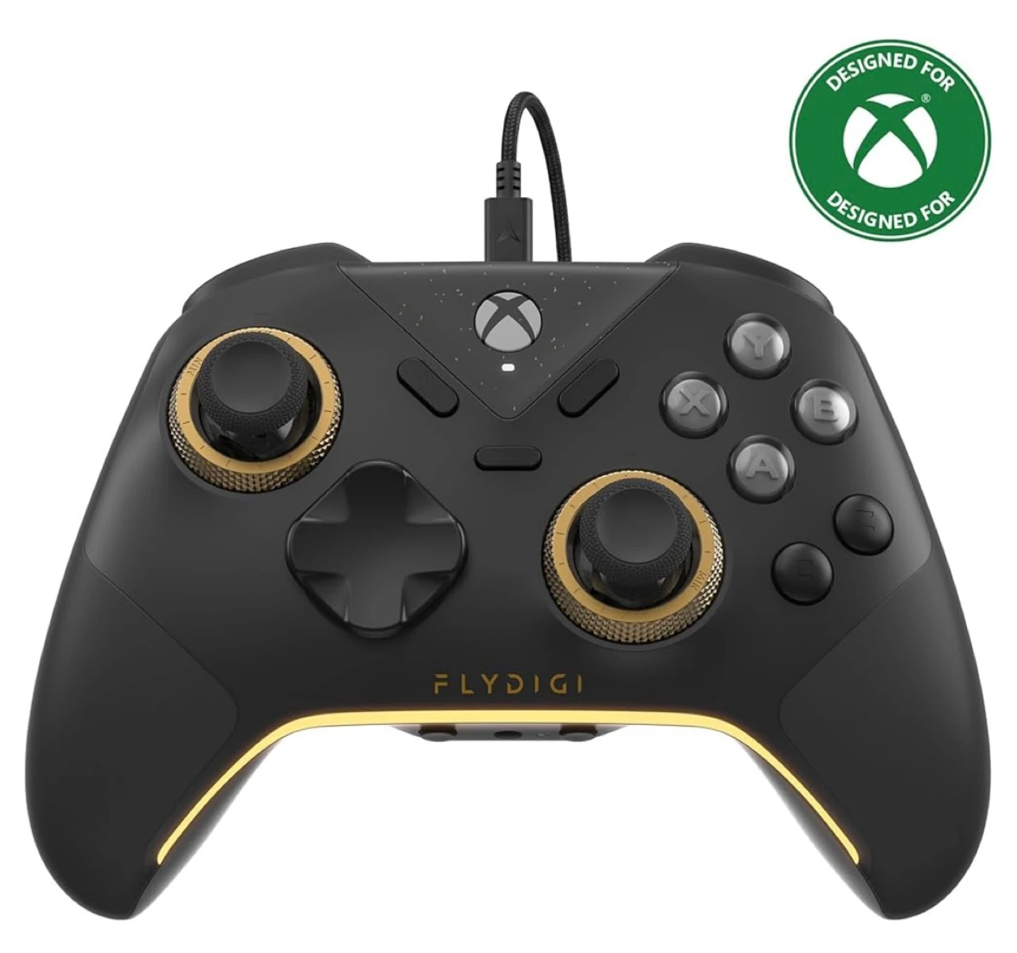 This is a black wired controller designed for Xbox. It features gold accents on the analog sticks and a glowing yellow light strip along the bottom. The controller has a textured grip for better handling. Designed for Xbox.