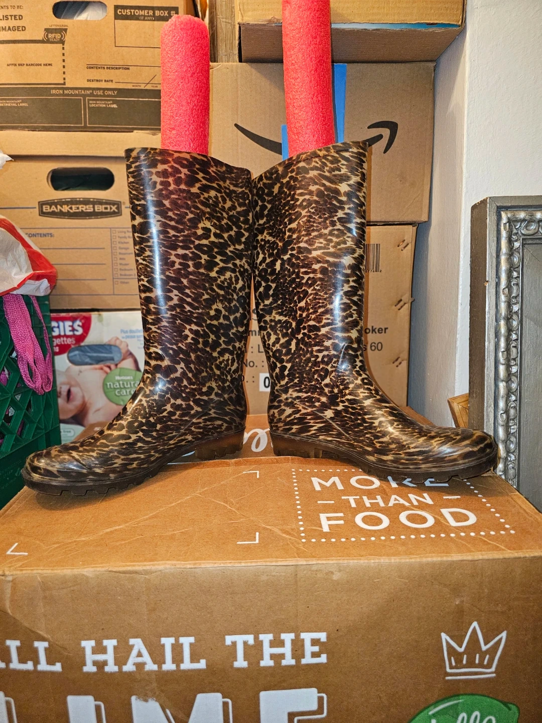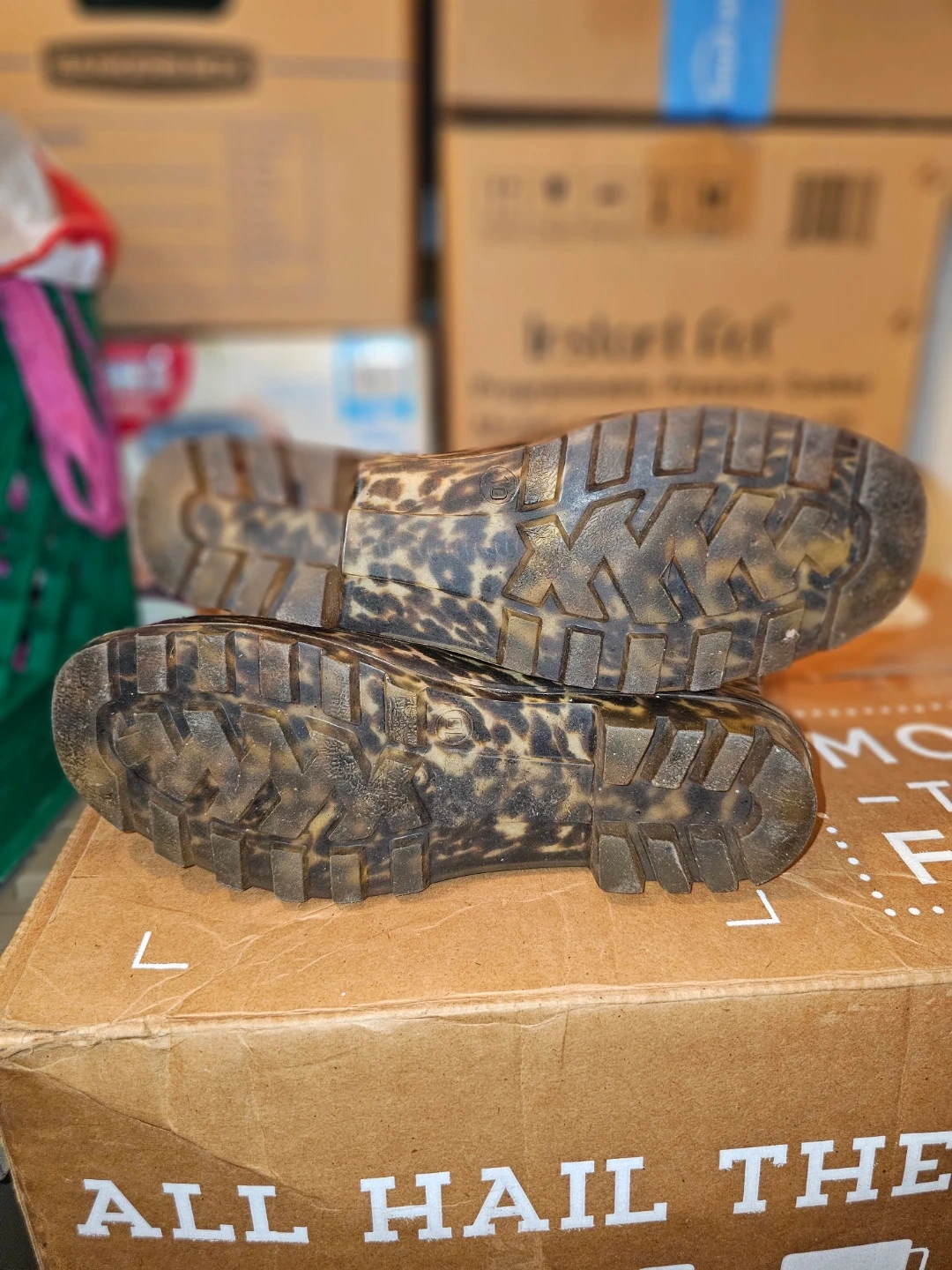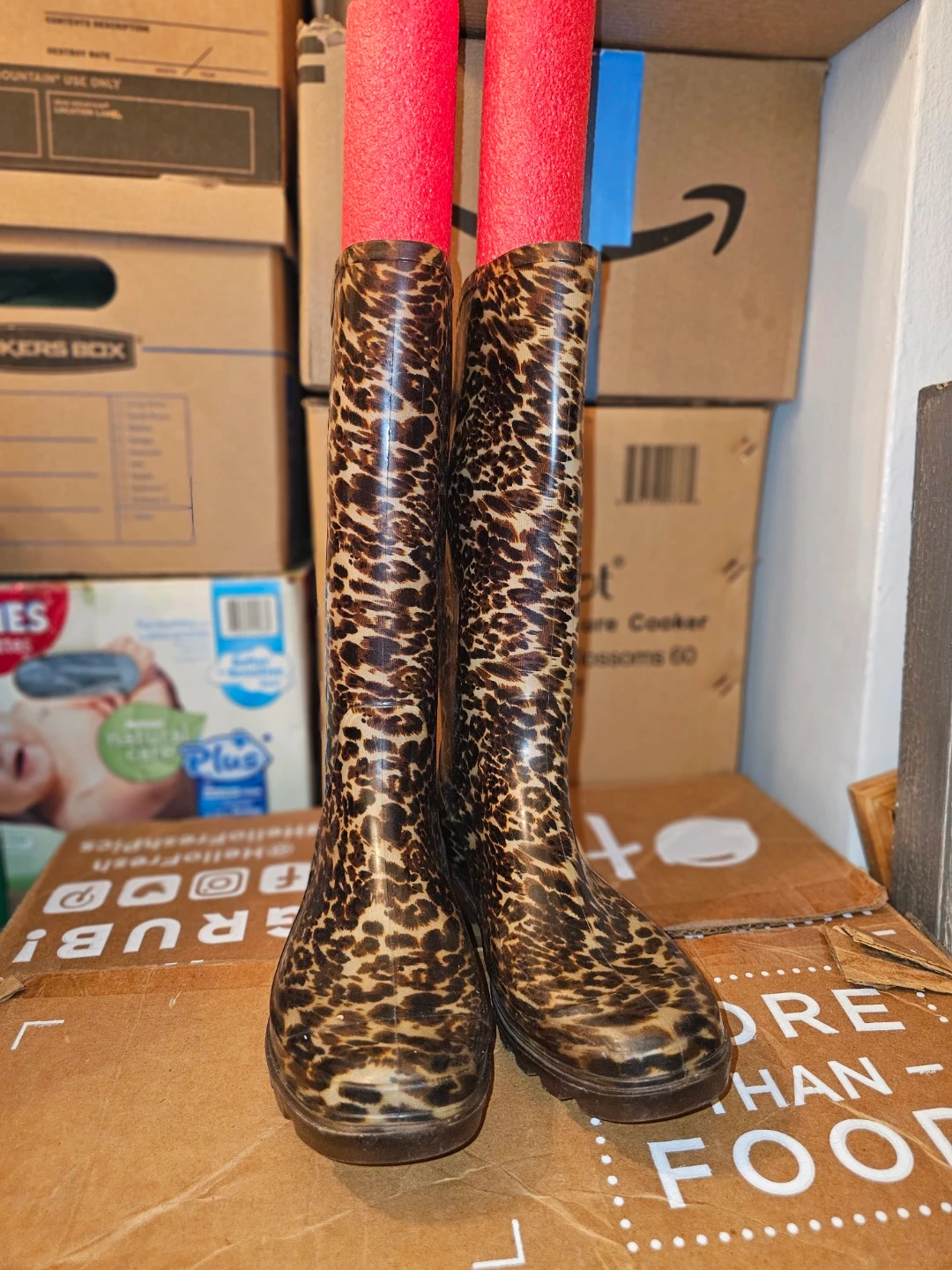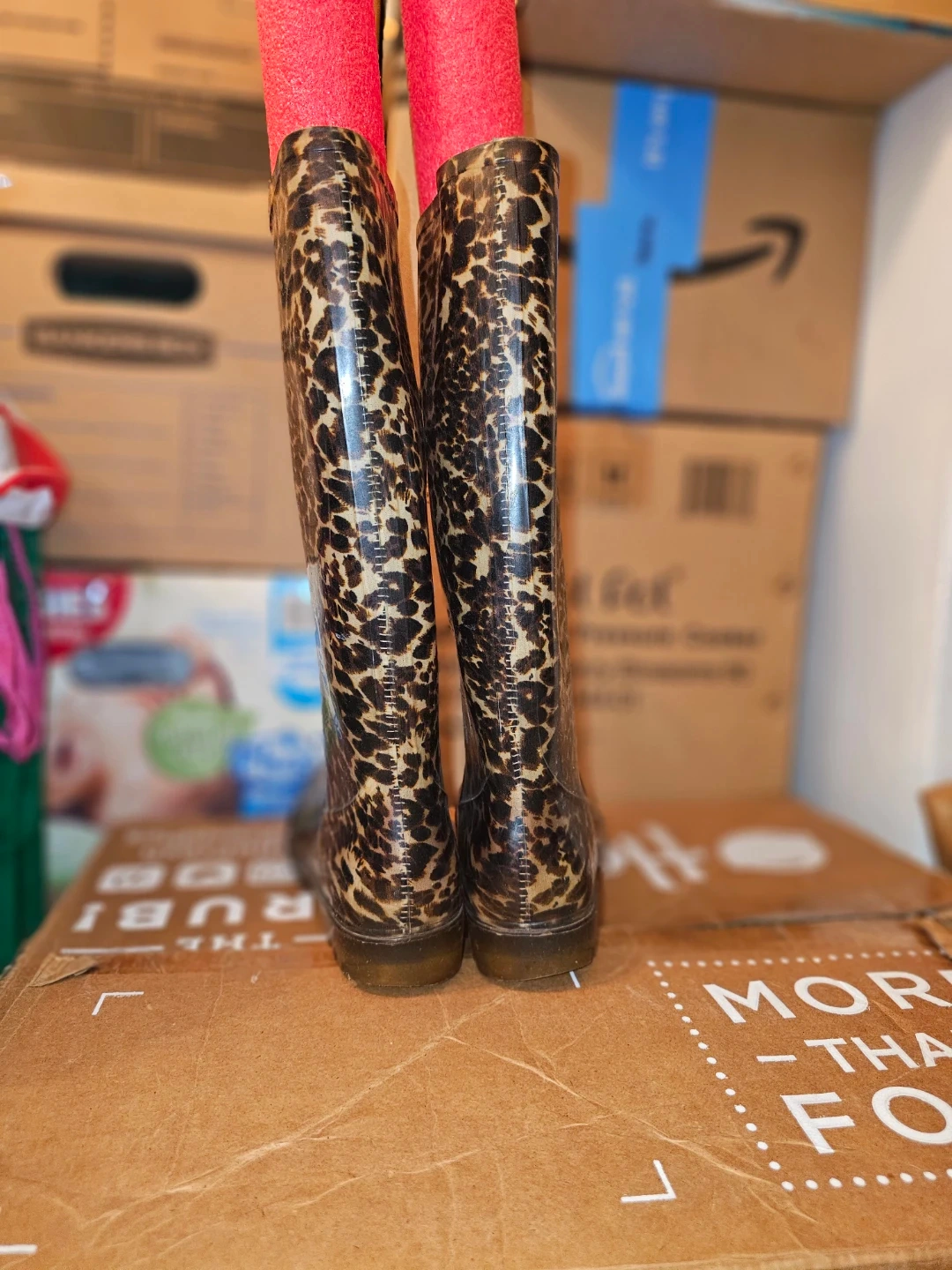 These knee-high rain boots feature a fun leopard print. They're size 10 and made of a waterproof material. The soles have good traction for wet surfaces.