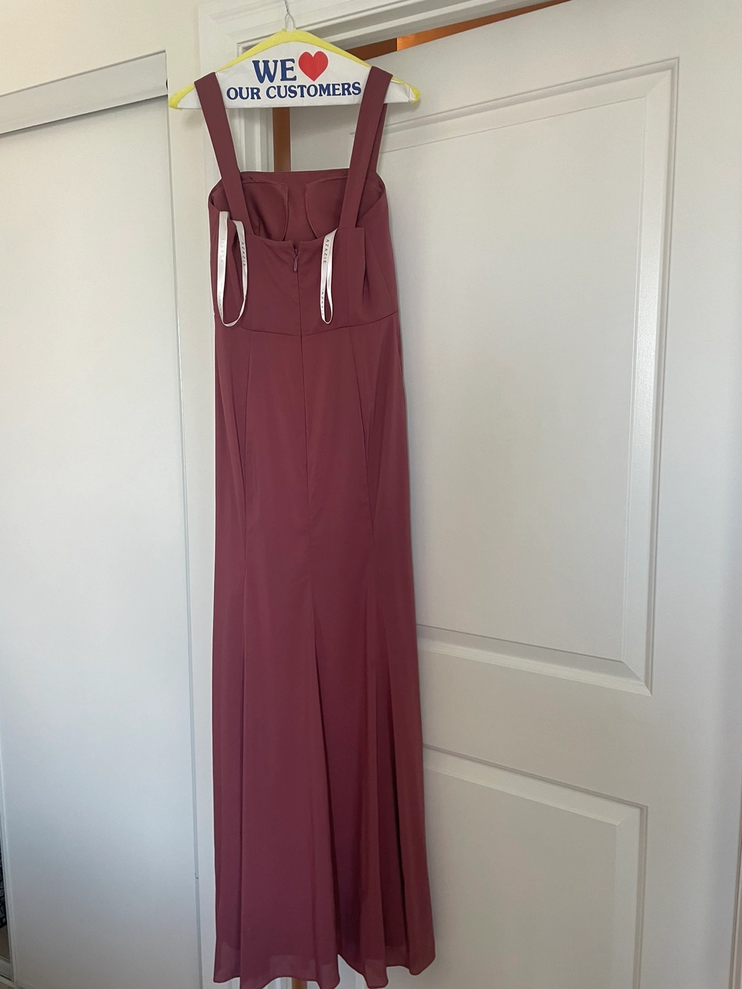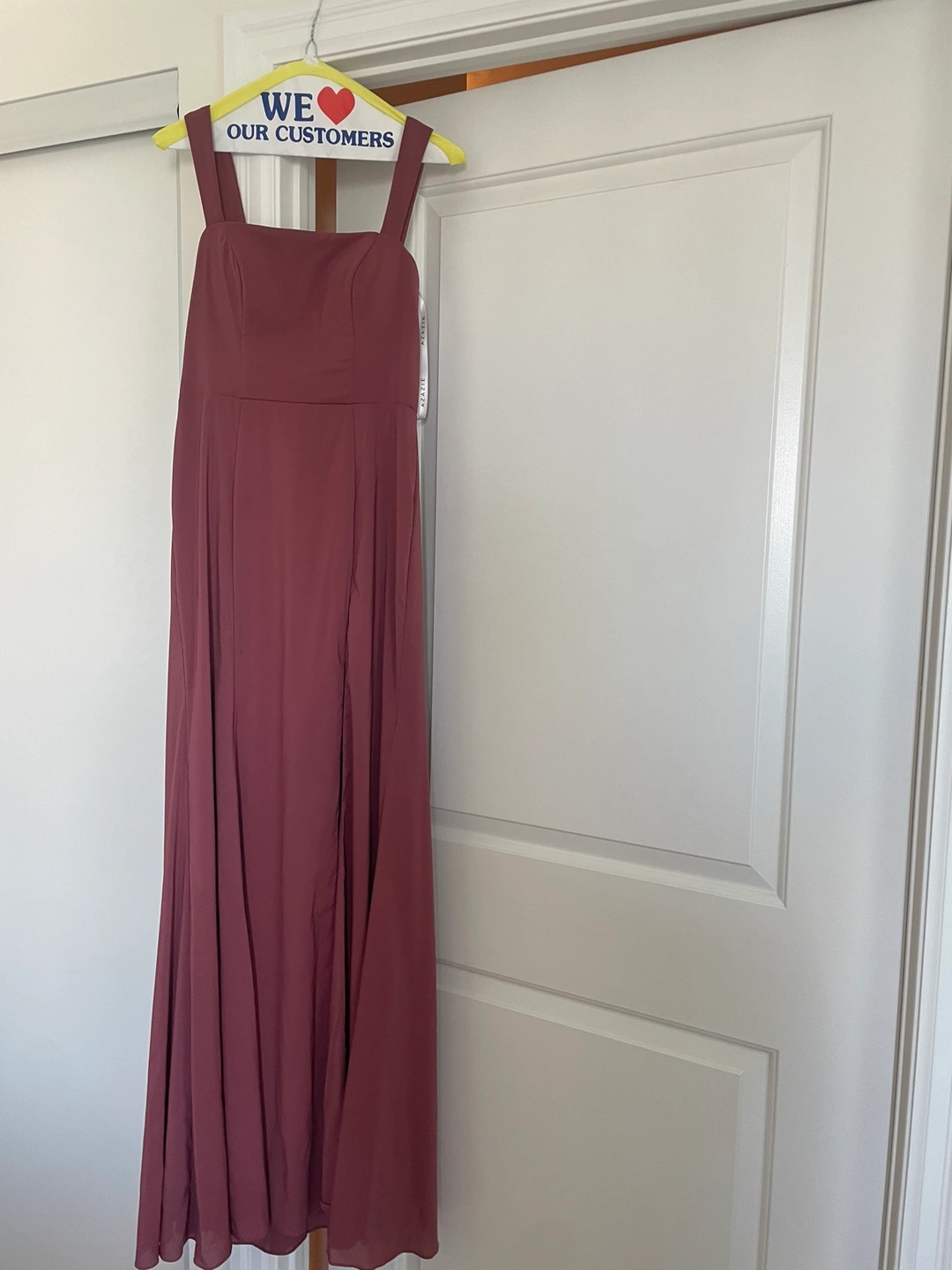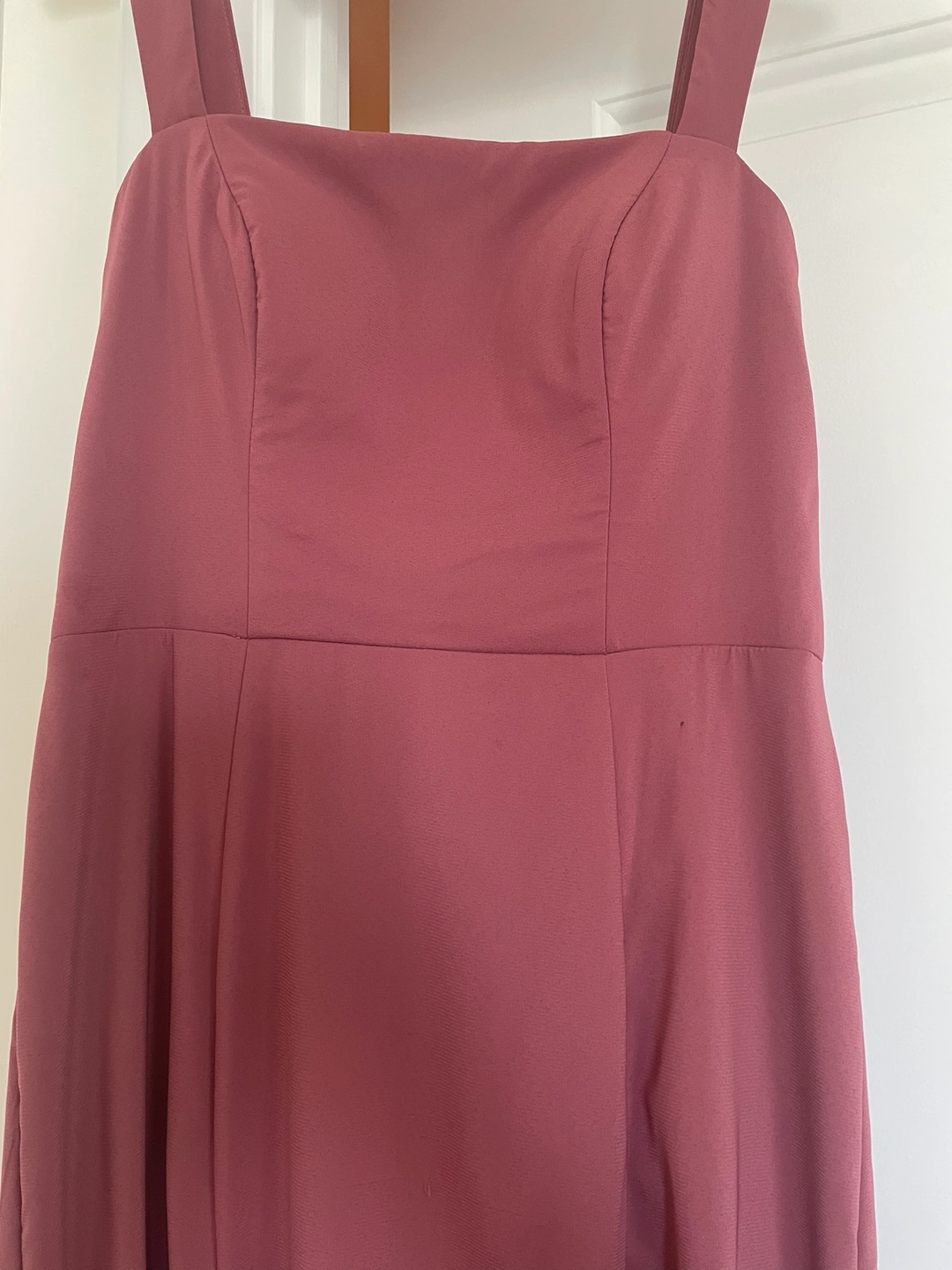 A beautiful deep pink maxi dress with a square neckline and a flattering fit. It is perfect for a special occasion. The dress has a front slit and a back zipper closure. It is made of a lightweight and comfortable material. The dress is in good condition and has been worn only once.