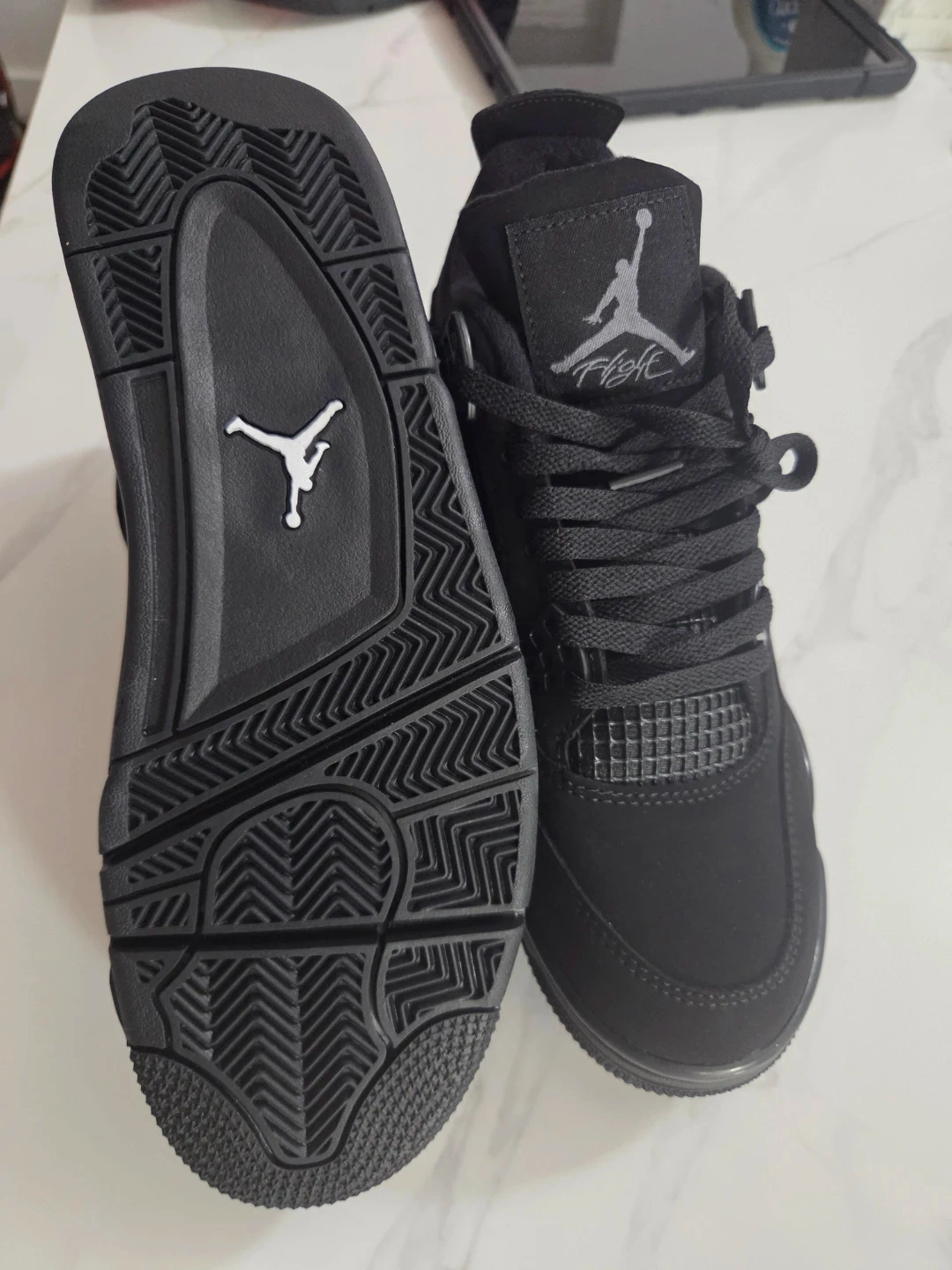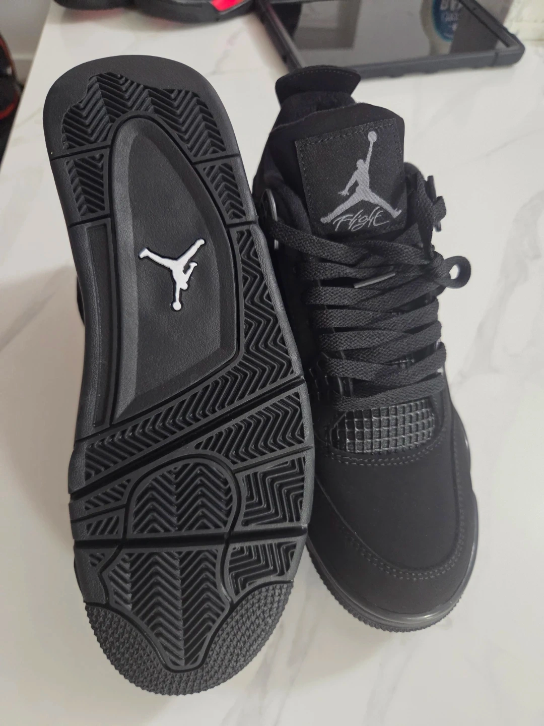 These Air Jordan 4s are a stealthy all-black colorway. They feature a Jumpman logo on the tongue and heel. Suede upper with a rubber sole.