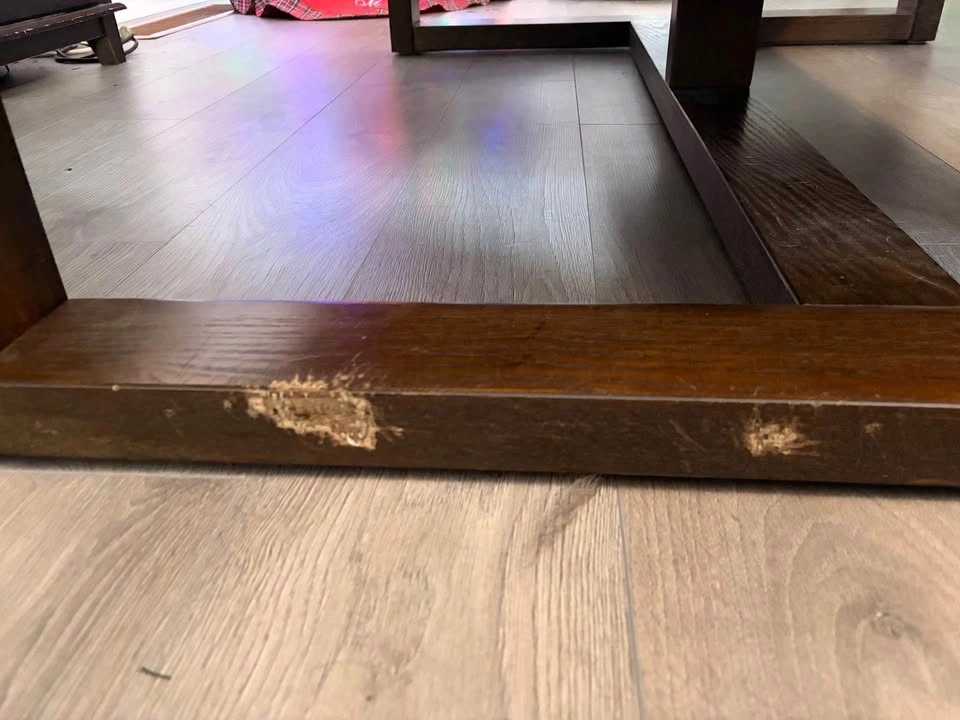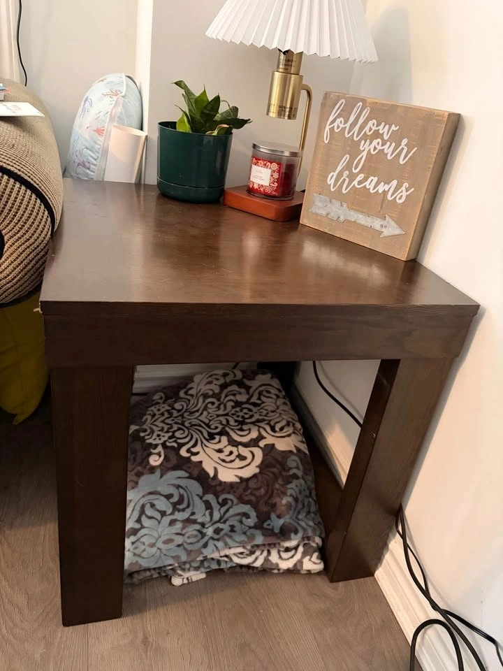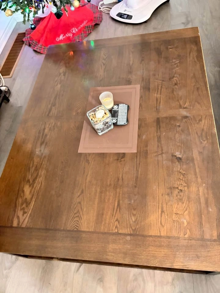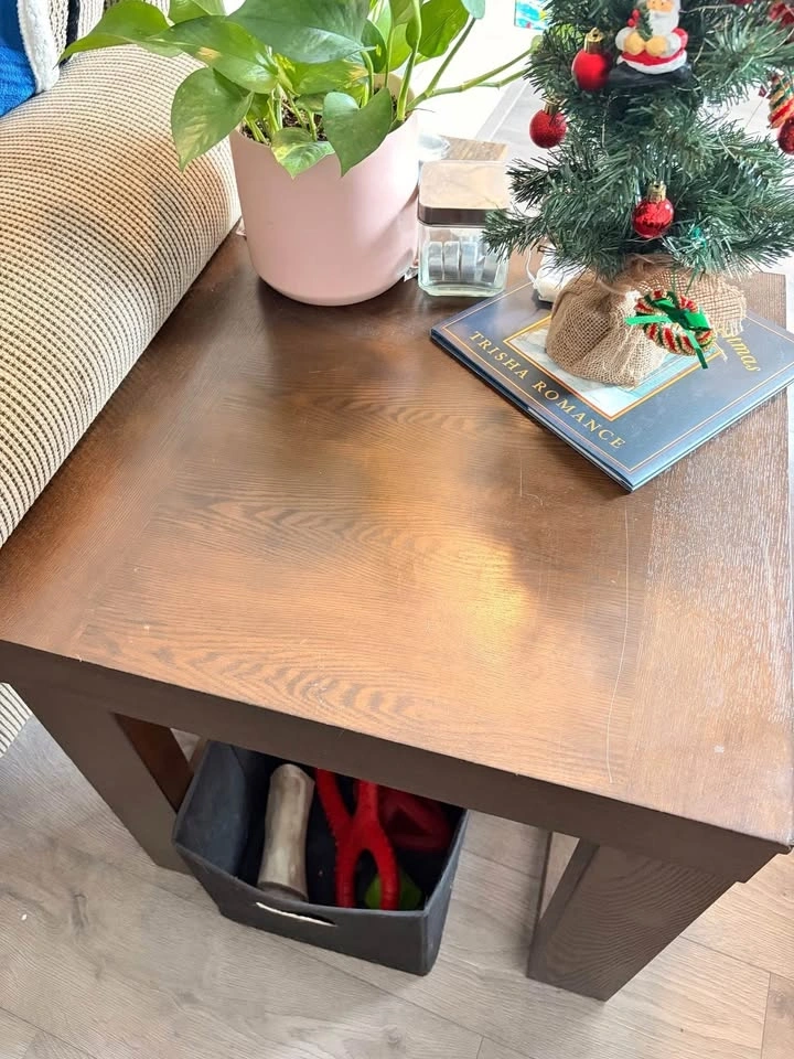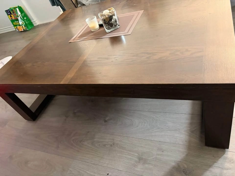 Selling a matching 3-piece table set originally from Ashley Furniture. Dark wood finish, sturdy design that works great in living rooms or family spaces. We are selling as it no longer fits properly in our new house. Coffee table dimensions: L: 56.25” x W:42.25” x H:16.75. Side tables dimensions: W: 24.25 x L: 24.25. There is some normal wear from everyday use, and a few visible scuffs/scratches on the lower leg (shown clearly in photos), nothing that affects function. Could be sanded and fixed. Pickup only - would recommend a truck and two people.
