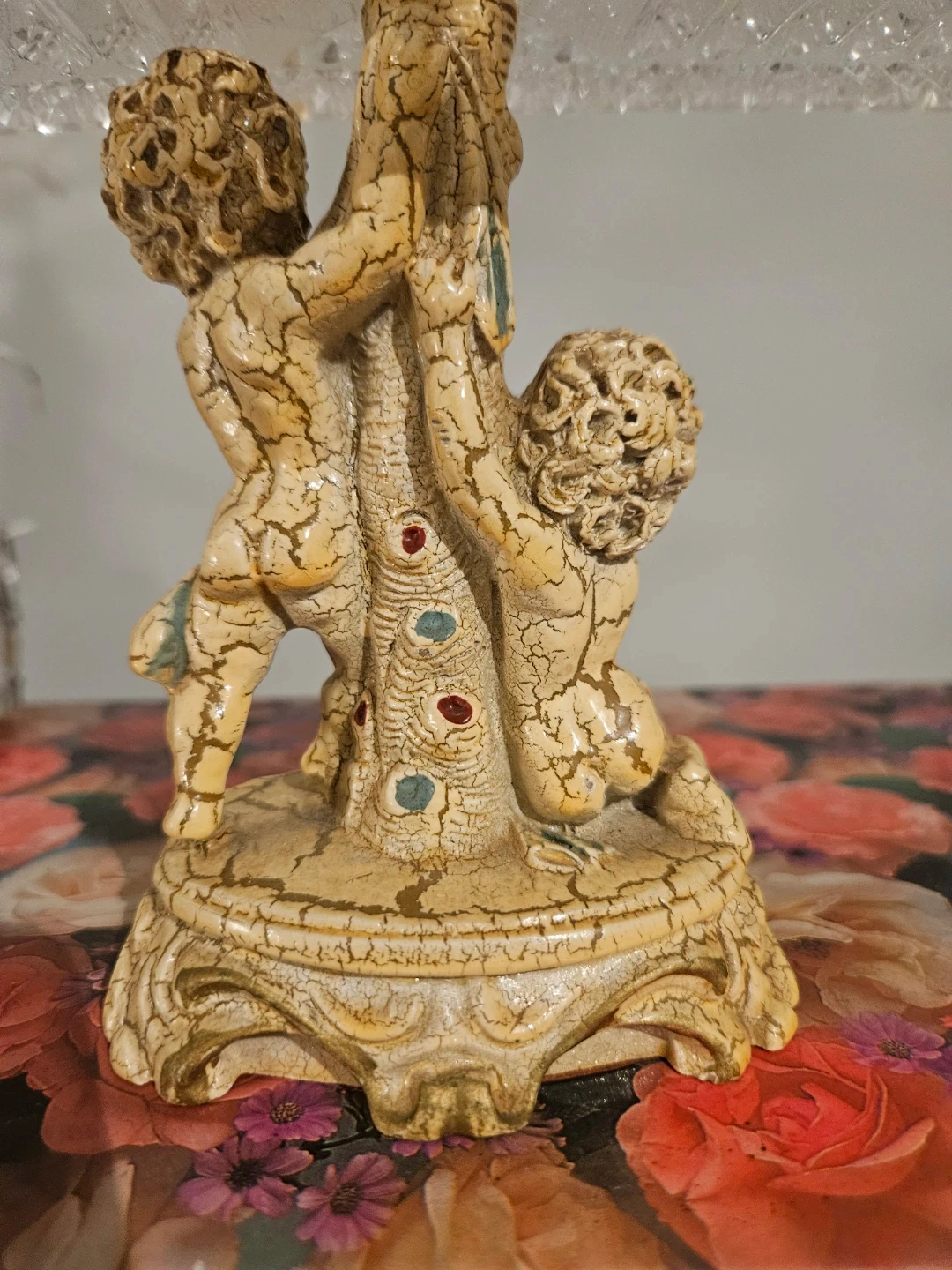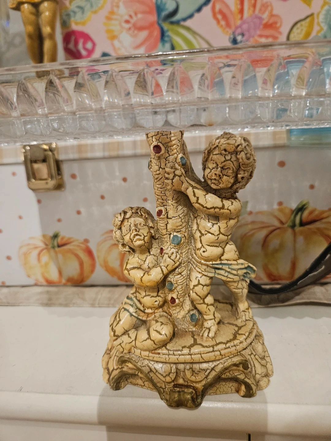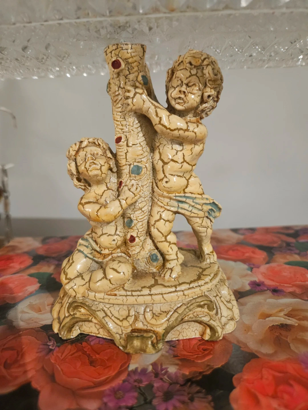 Decorative candlestick holder featuring cherubs climbing a tree. Crafted in Italy, it showcases intricate crackle glaze details. Perfect for adding a touch of vintage charm to your decor!