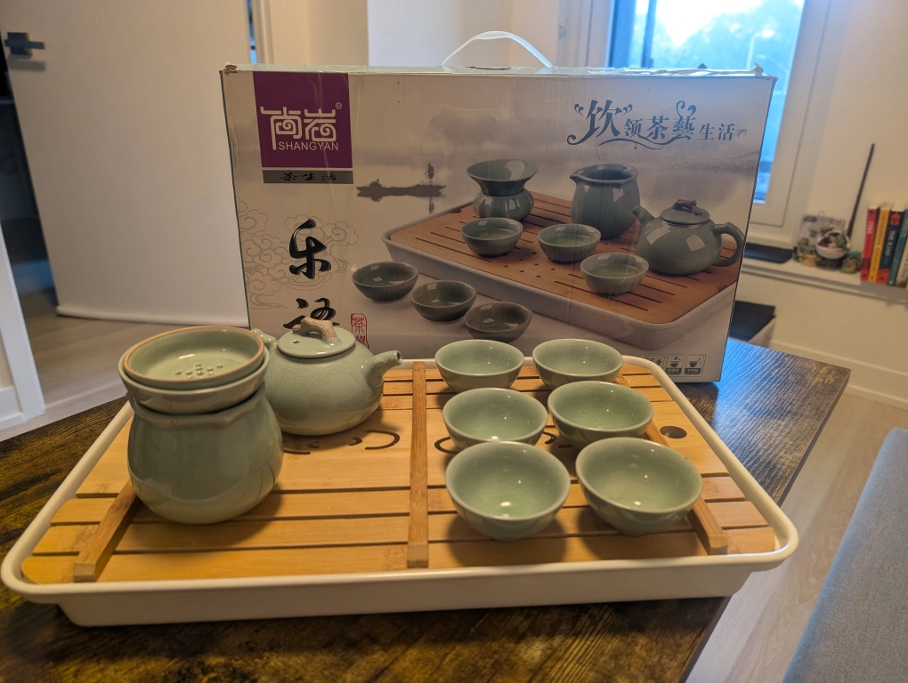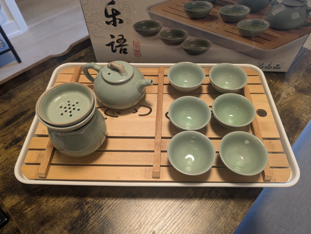 Includes several small cups, a tea pot, and a server. Set also includes a wooden tray. Great for enjoying a relaxing cup of tea in the afternoon. Brand new - never been used.