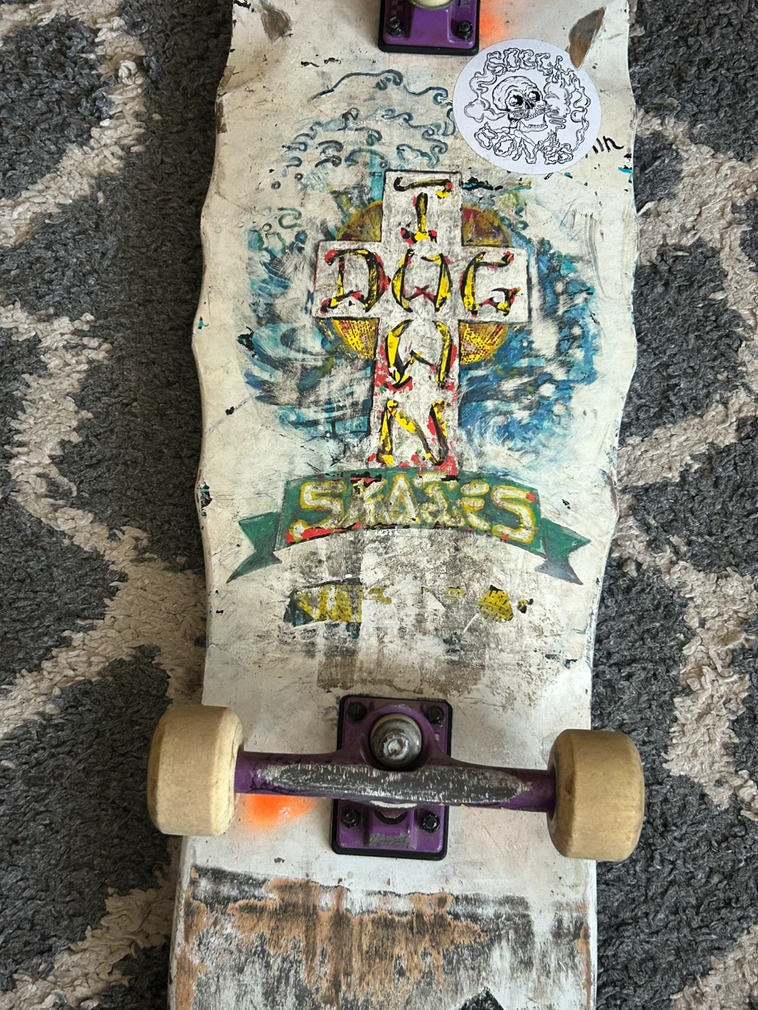 A vintage Dogtown skateboard deck. It has a unique cross graphic on the top. Deck shows signs of wear and tear, consistent with its age and use.