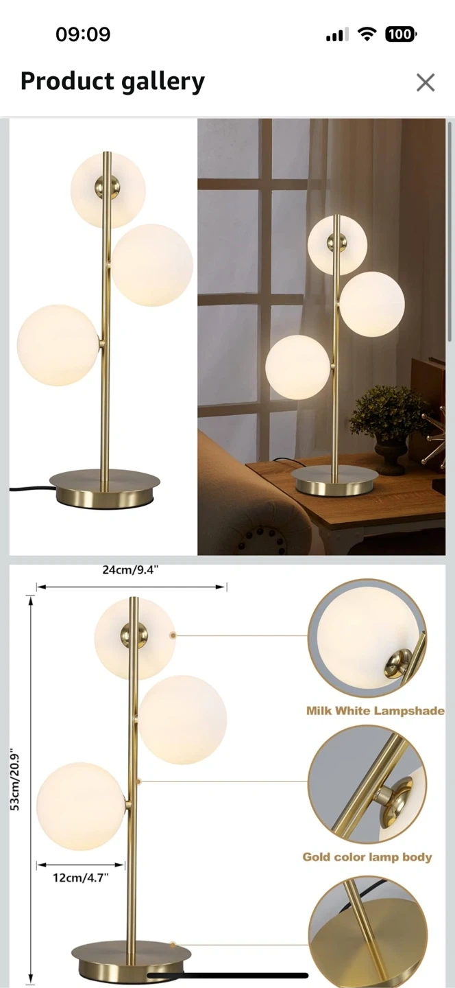99This is a 3 Lights Brass Metal Bedside Lamp, Mid Century Globe Table Light, White and Gold Reading Lamp for Office Living Room Dresser Bathroom, G9 Base. The base material is metal and the shade material is glass. The product dimensions are 9.4"D x 9.4"W x 20.9"H. It features a mid-century design with three white glass globe lampshades and a gold lamp body - original price $99+tax - in like new condition