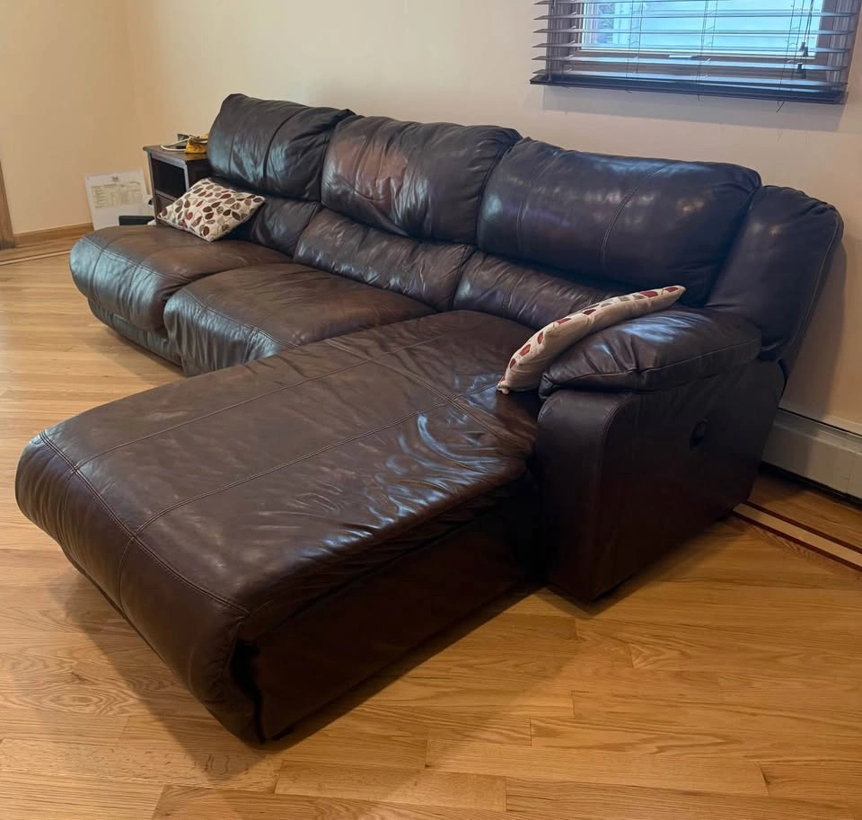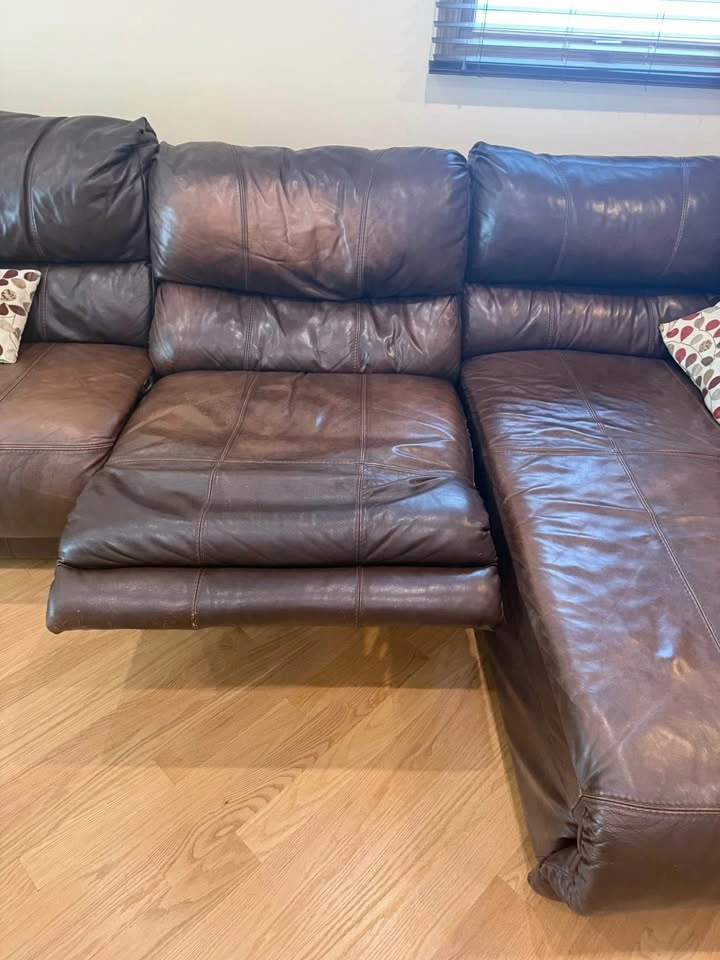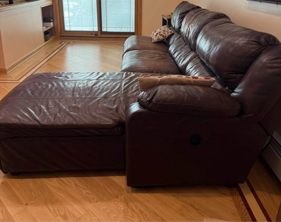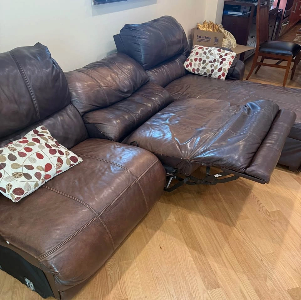Comfortable and durable leather sectional with manual recliner and reclining chaise. Originally a 4-piece set, one piece was removed due to damage, so this is now a 3-piece sectional. π Approximate Dimensions: β’ Length: 112β β’ Depth: 42β β’ Chaise Length: 78β The sectional shows some natural wear (as seen in photos/video), but itβs extremely sturdy and still has plenty of life left. β Leather construction β built to last β Manual recliner + reclining chaise for extra comfort β Great for family rooms, basements, or a starter setup Must be picked up. I can assist with loading.