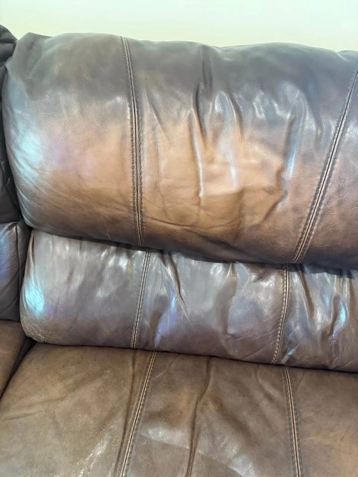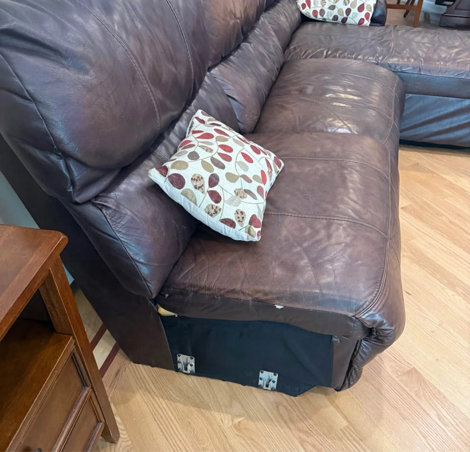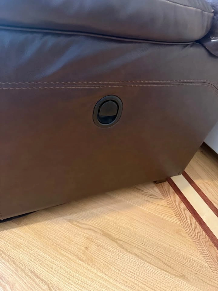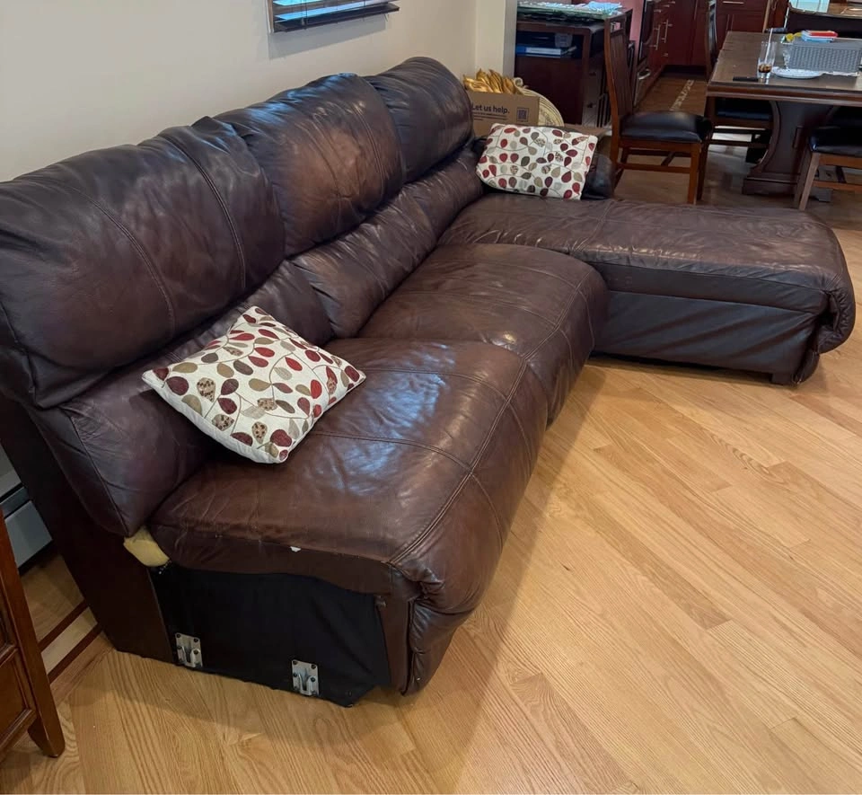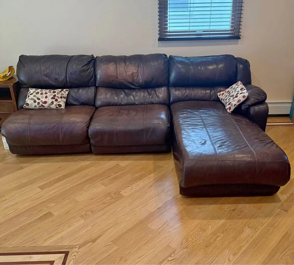 Comfortable and durable leather sectional with manual recliner and reclining chaise. Originally a 4-piece set, one piece was removed due to damage, so this is now a 3-piece sectional. π Approximate Dimensions: β’ Length: 112β β’ Depth: 42β β’ Chaise Length: 78β The sectional shows some natural wear (as seen in photos/video), but itβs extremely sturdy and still has plenty of life left. β Leather construction β built to last β Manual recliner + reclining chaise for extra comfort β Great for family rooms, basements, or a starter setup Must be picked up. I can assist with loading.