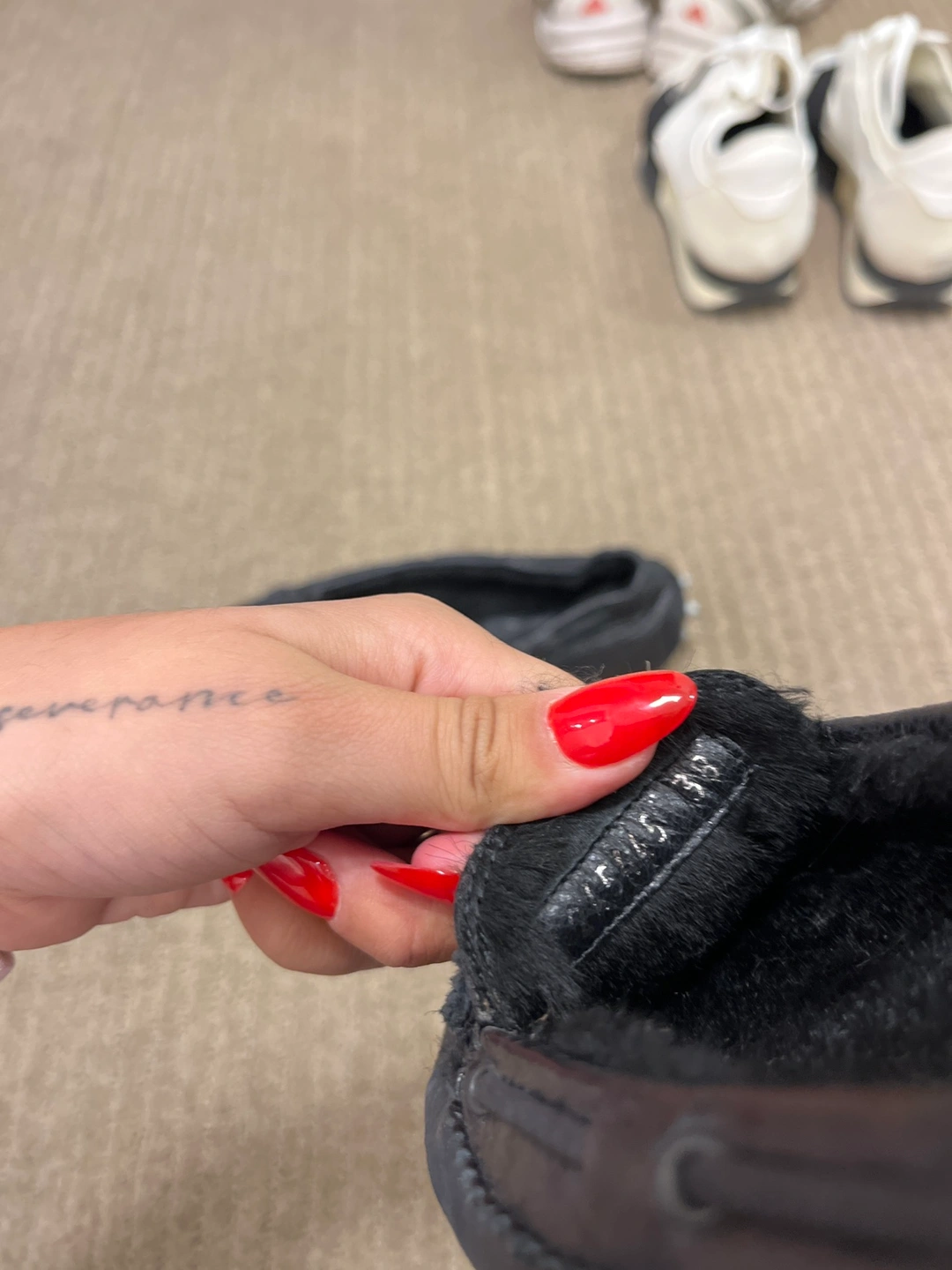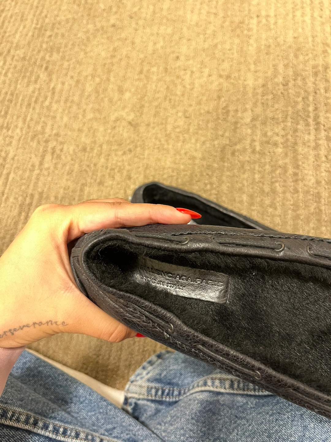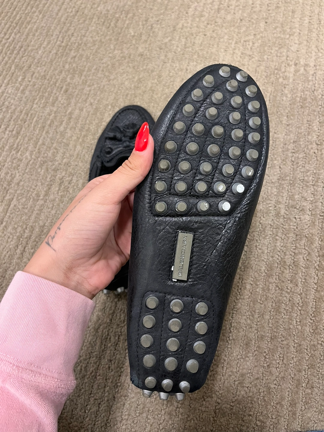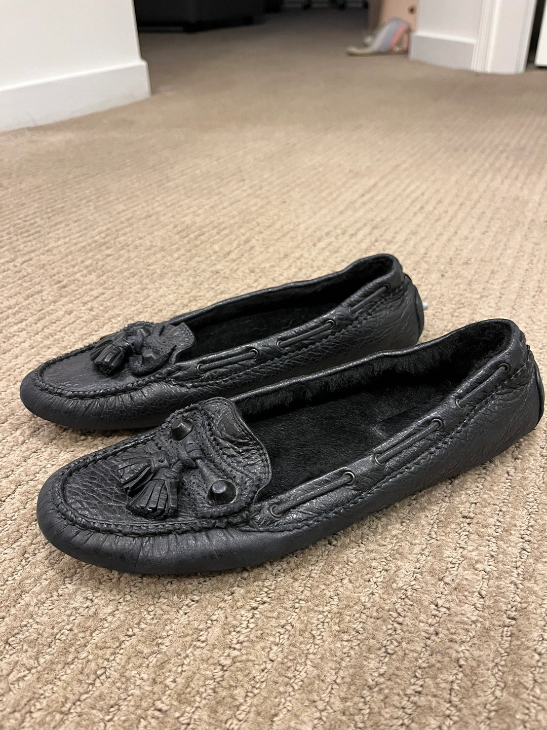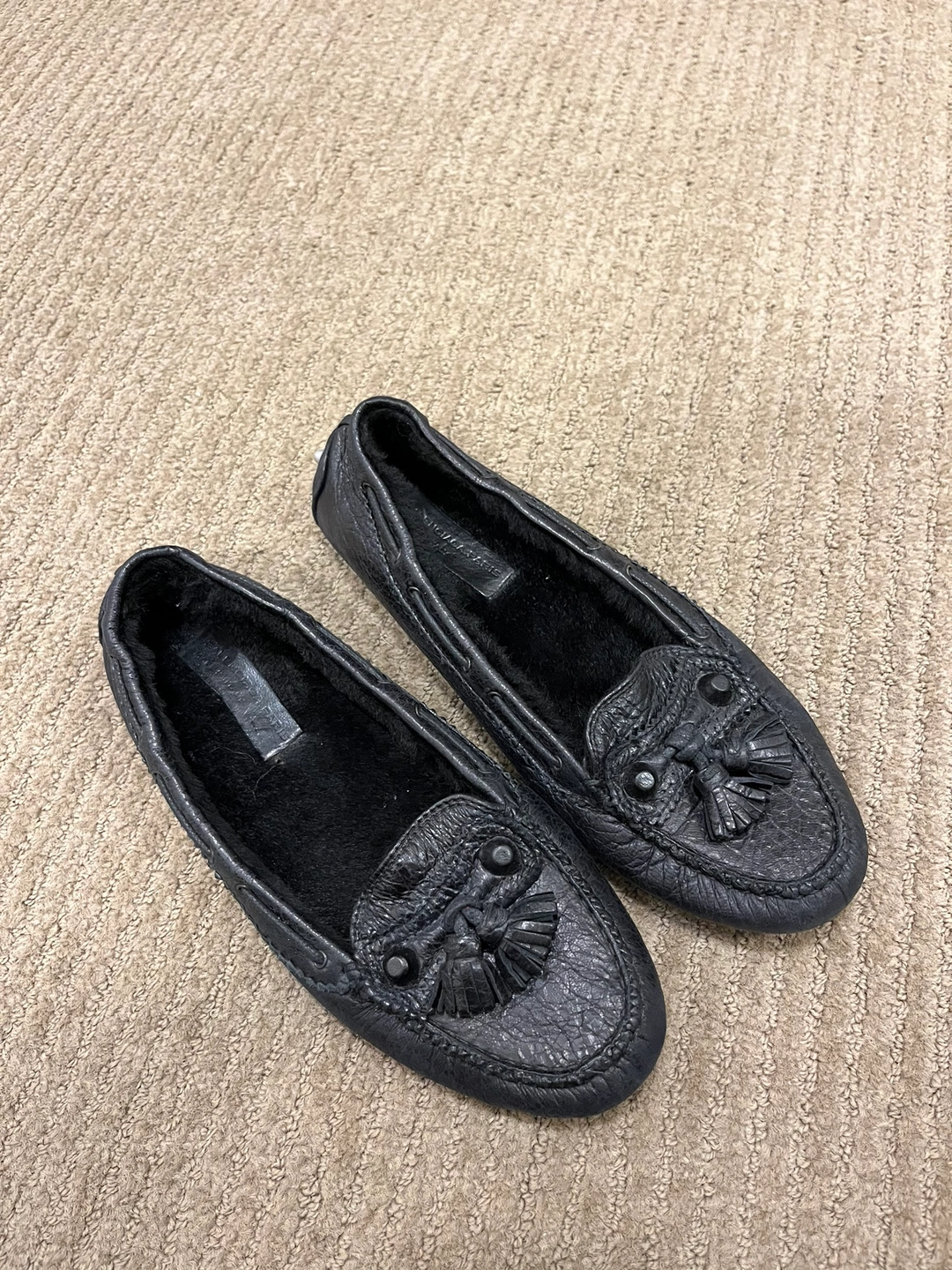These are black leather loafers with a tassel detail. They have a rubber sole with studded accents. Great condition and authentic, I want someone else to enjoy pieces I don’t wear anymore