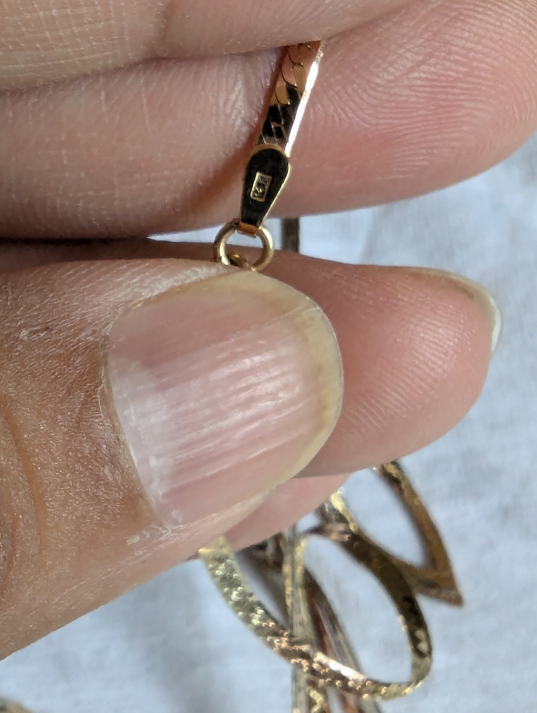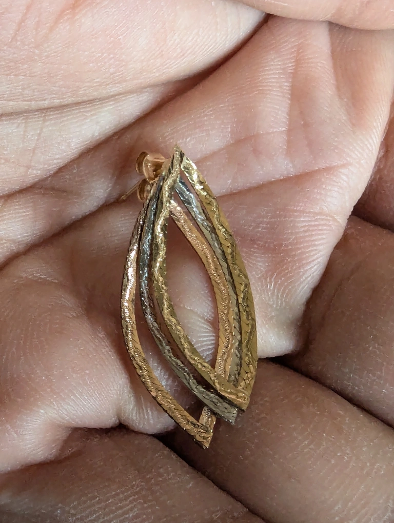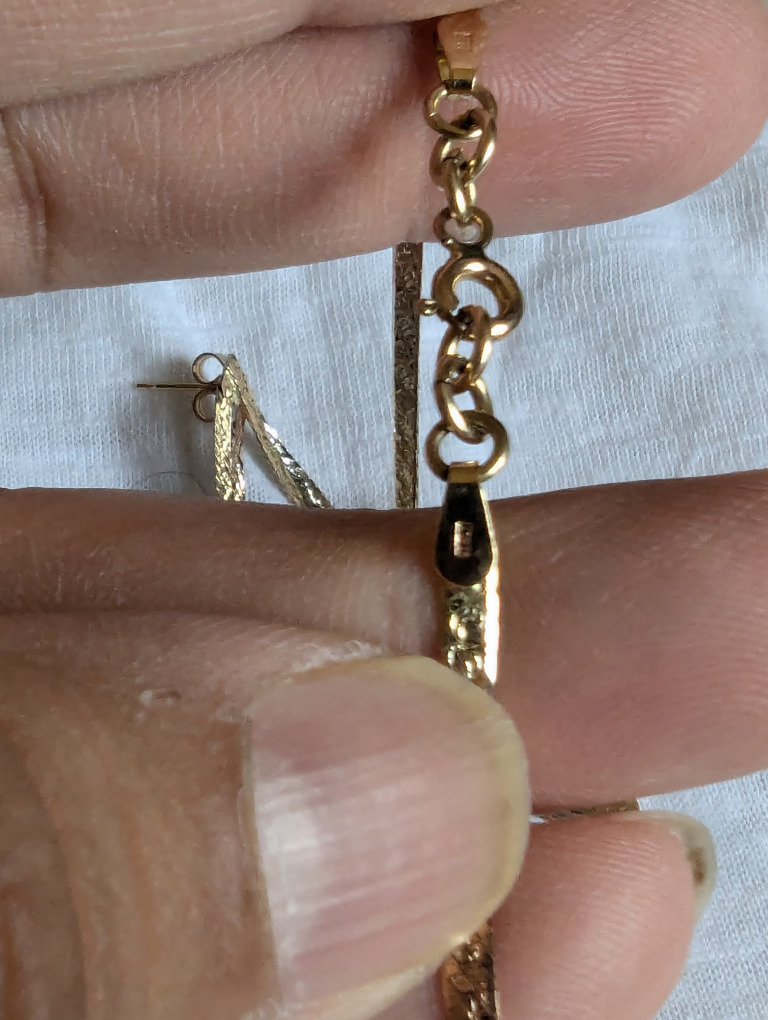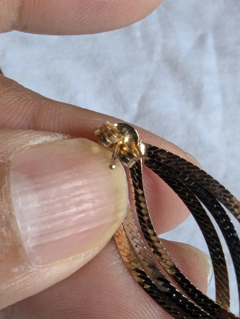 These are solid 14 karat gold pieces it's a matching set of necklace, bracelet and a pair of tri gold dangle earrings with a textured design. They are marked 14K. They are approximately 1 1/4" long. They are in good condition brand new condition.