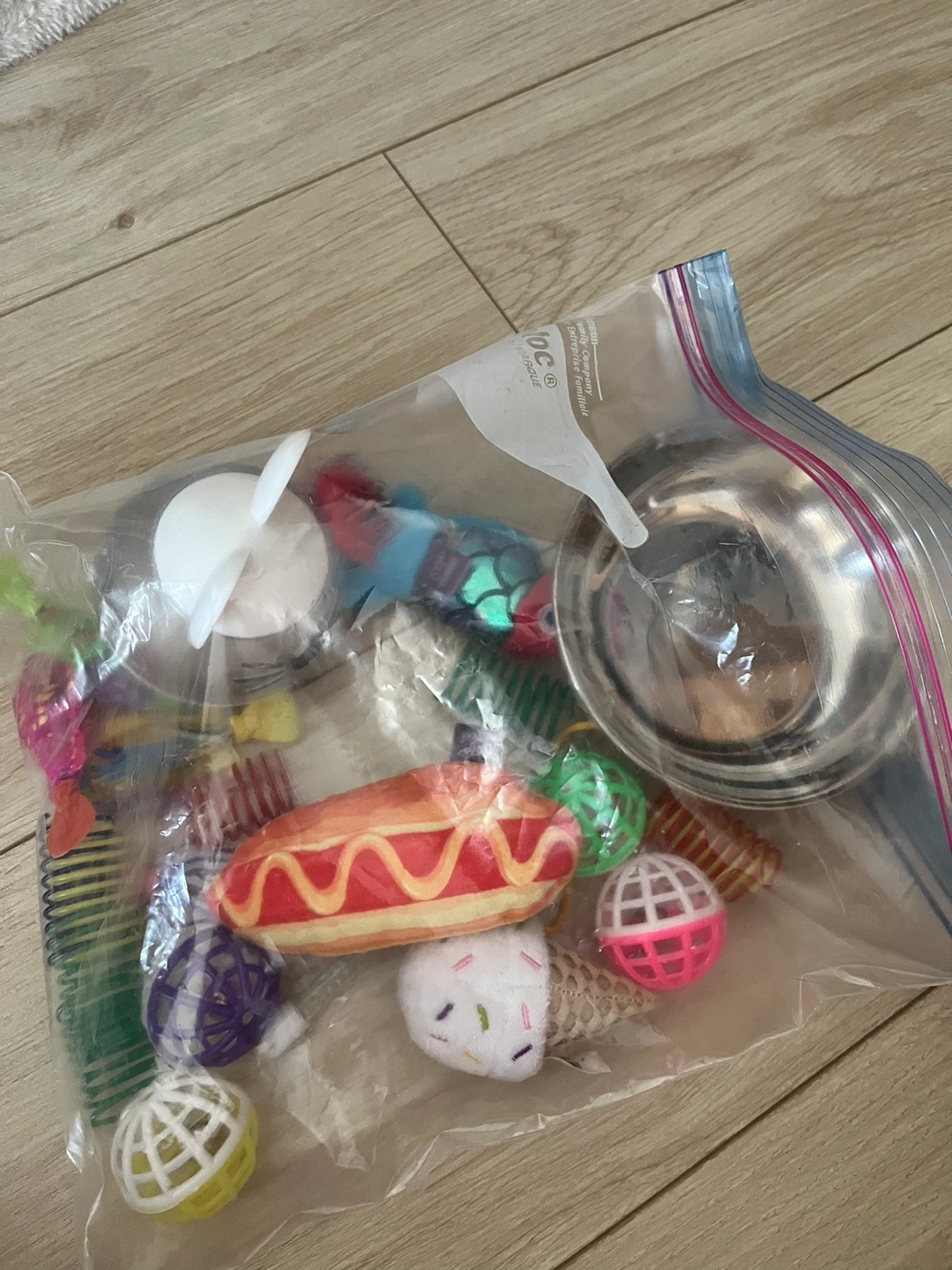 A bag of assorted cat toys. There is a variety of toys included, such as a hot dog, a catnip mouse, a spring, a ball and an ice cream cone. A metal bowl is also included in this bag. Robot fish that swim. It is all in good condition. Pickup only at Eglinton station.