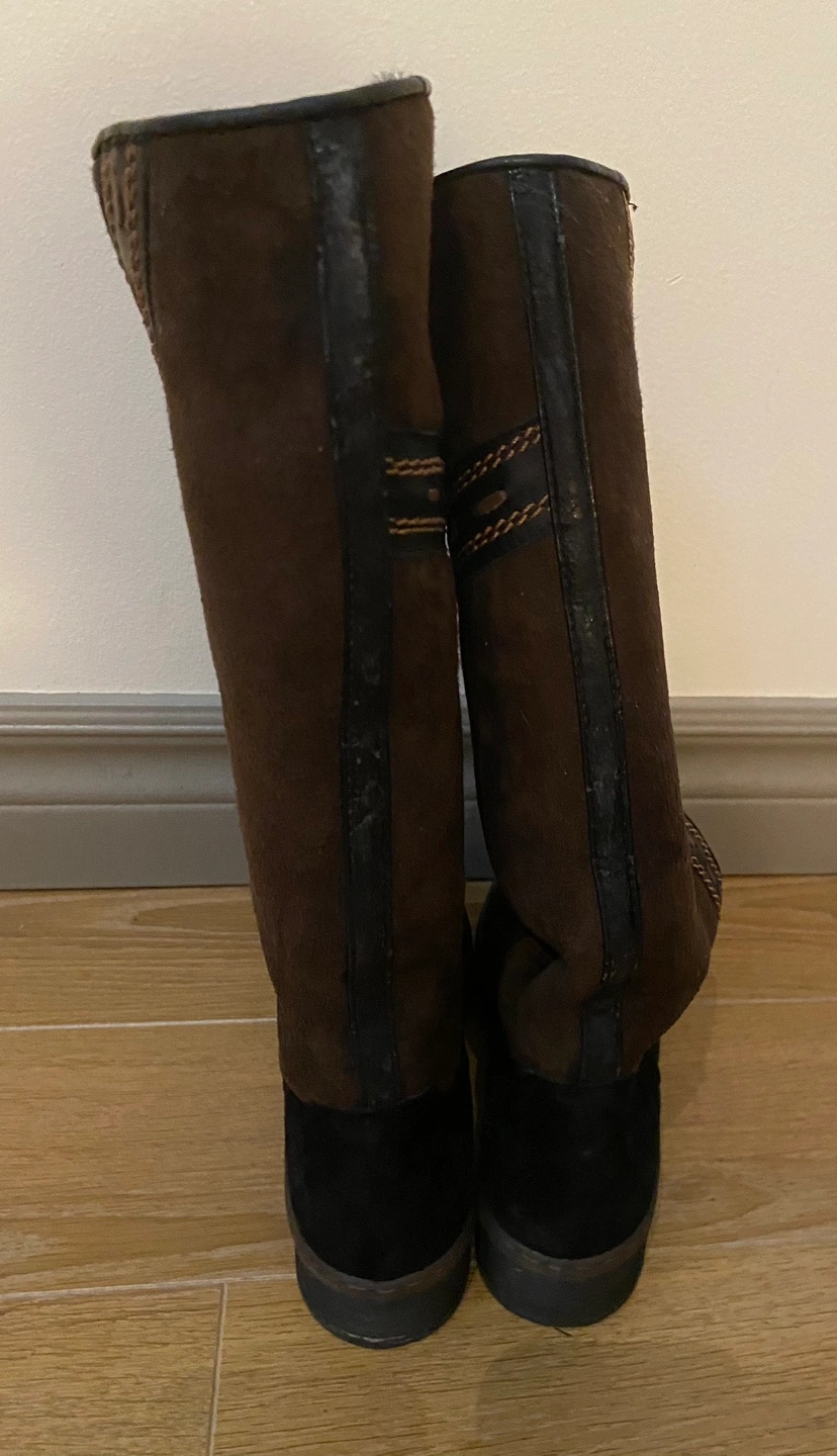 Women's knee-high brown and black suede boots with stitching details. The boots have fur lining and is waterproof thus ideal for winter. Size: 36. There’s still with a lot of life left.