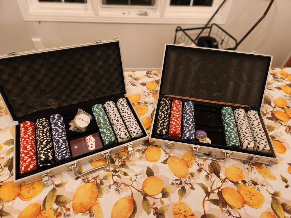 Two sets of poker chips, each with a carrying case.