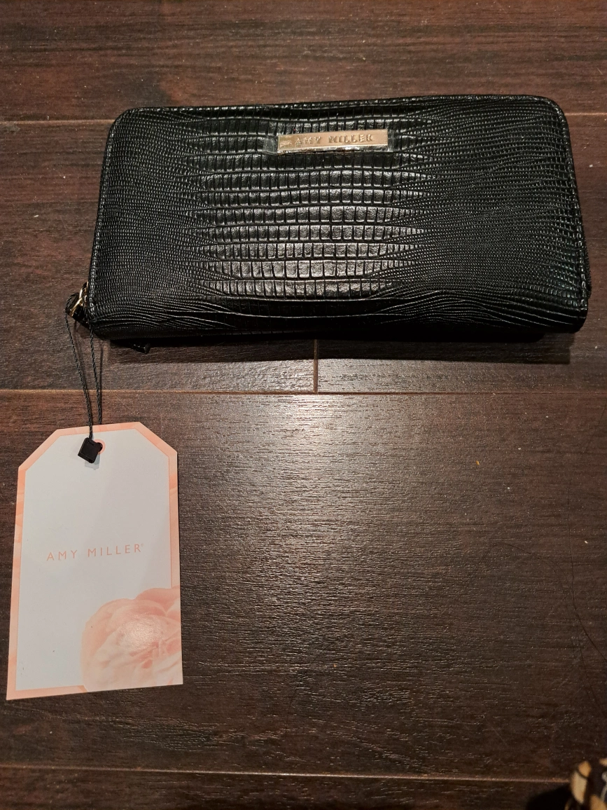 Black wallet by Amy Miller with a snakeskin pattern. The wallet has a gold zipper and a gold tag on the front.