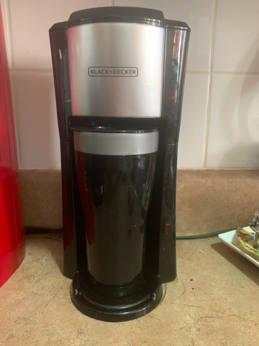 A Black + Decker single serve coffee maker in great condition. It includes the reusable filter and carafe. The buttons are responsive and it heats quickly.