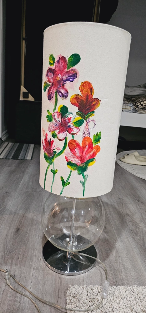 A unique table lamp featuring a white drum shade with hand painted floral designs. The lamp has a clear glass orb base and a chrome finish.