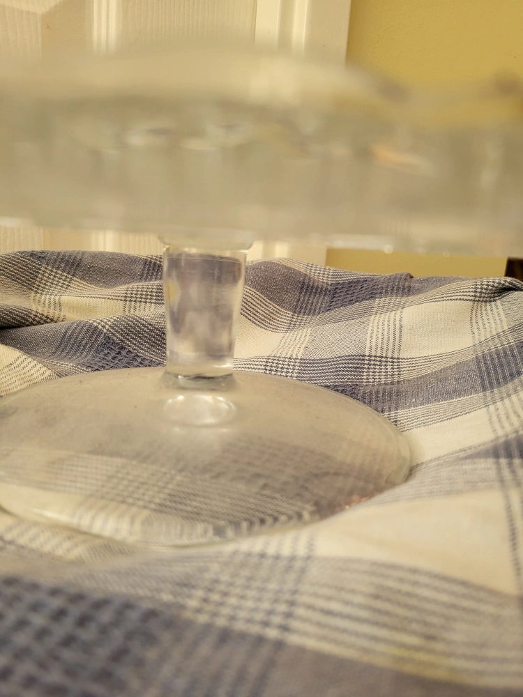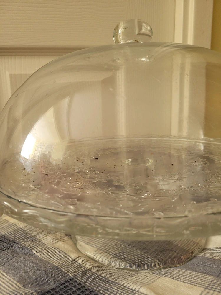 A glass cake dome with a matching stand. The dome and stand have an etched floral pattern. The dome has a small knob for lifting. The stand has a wide base. Beautiful for counter display.