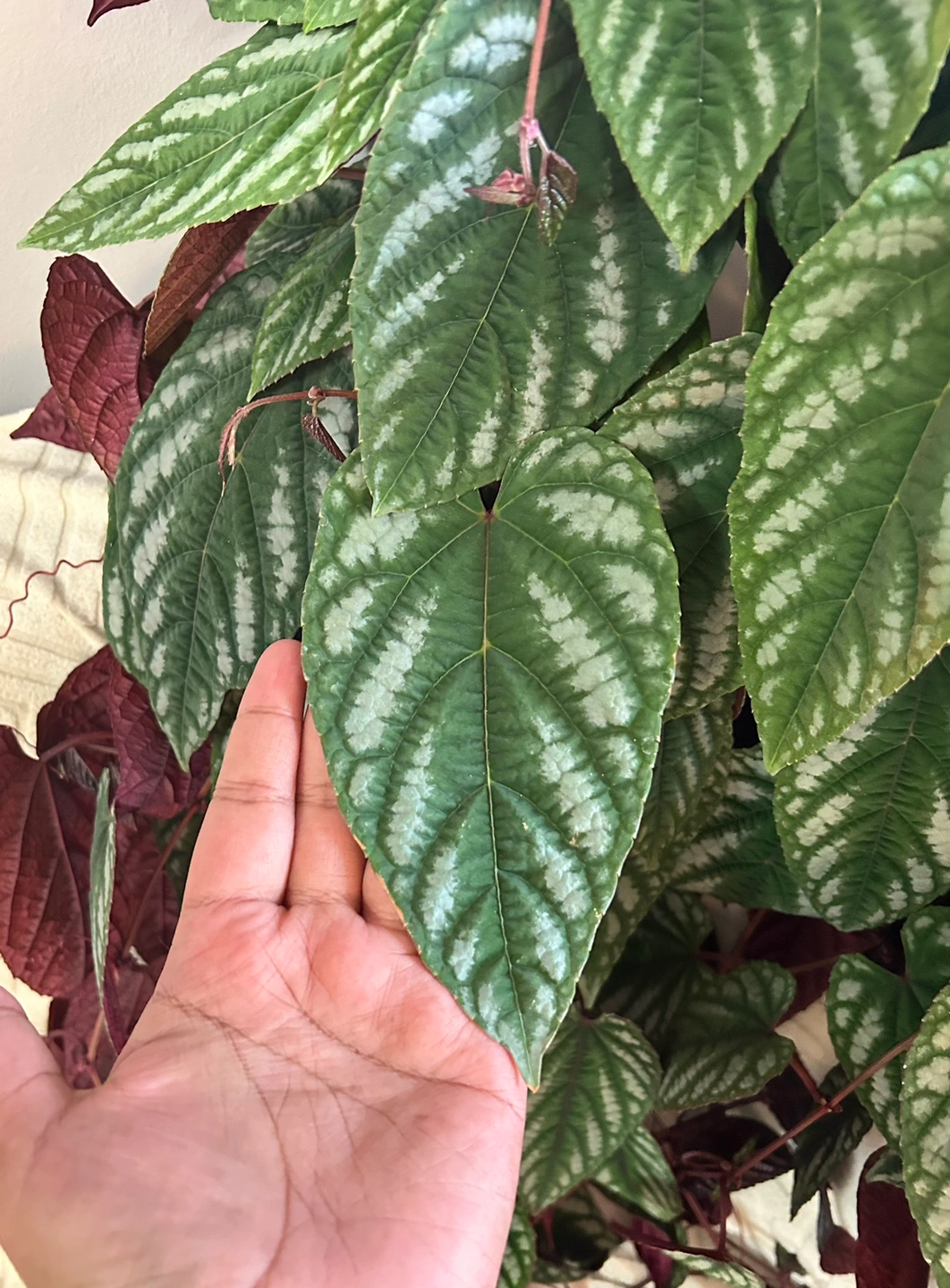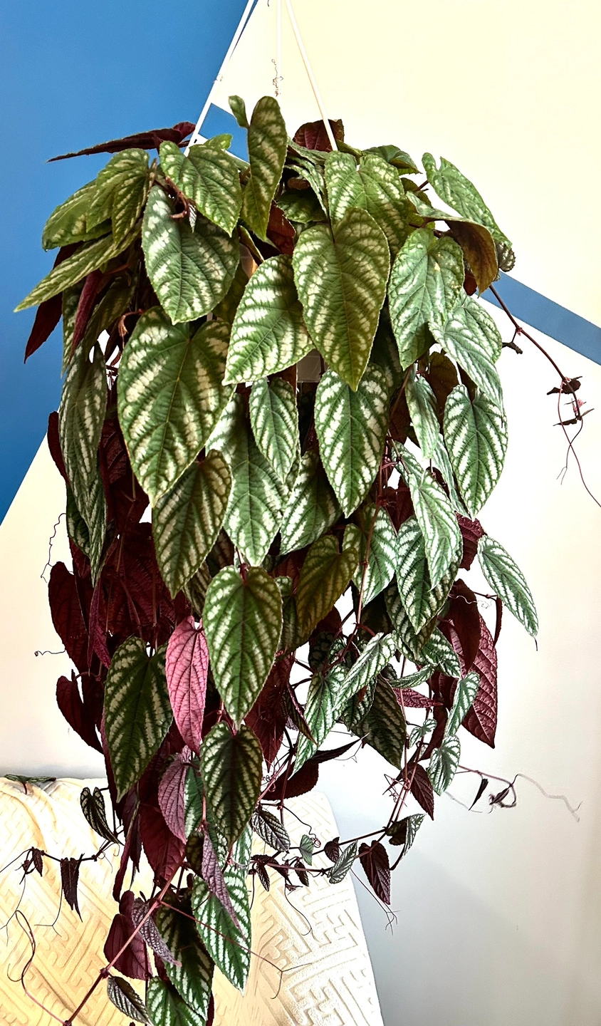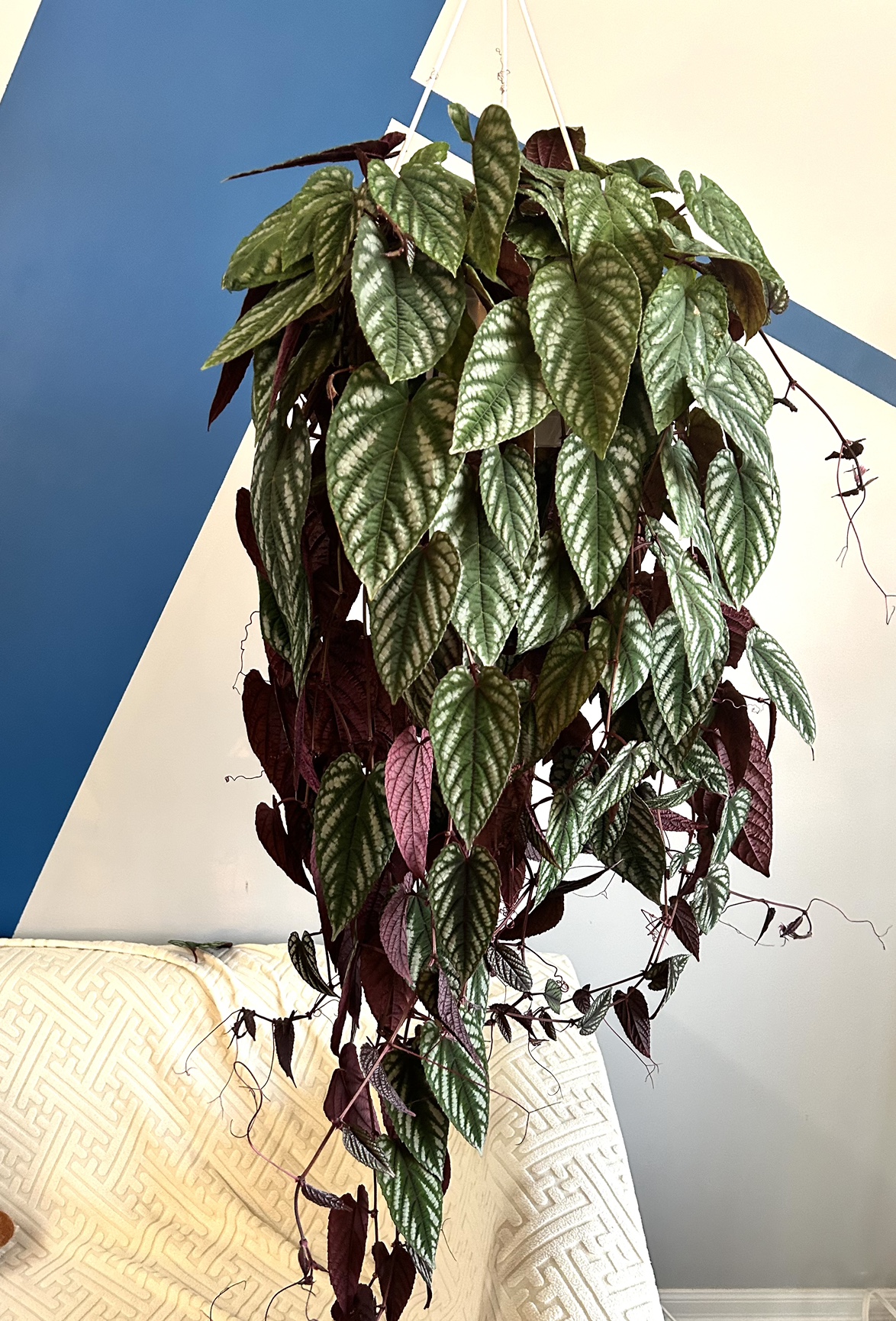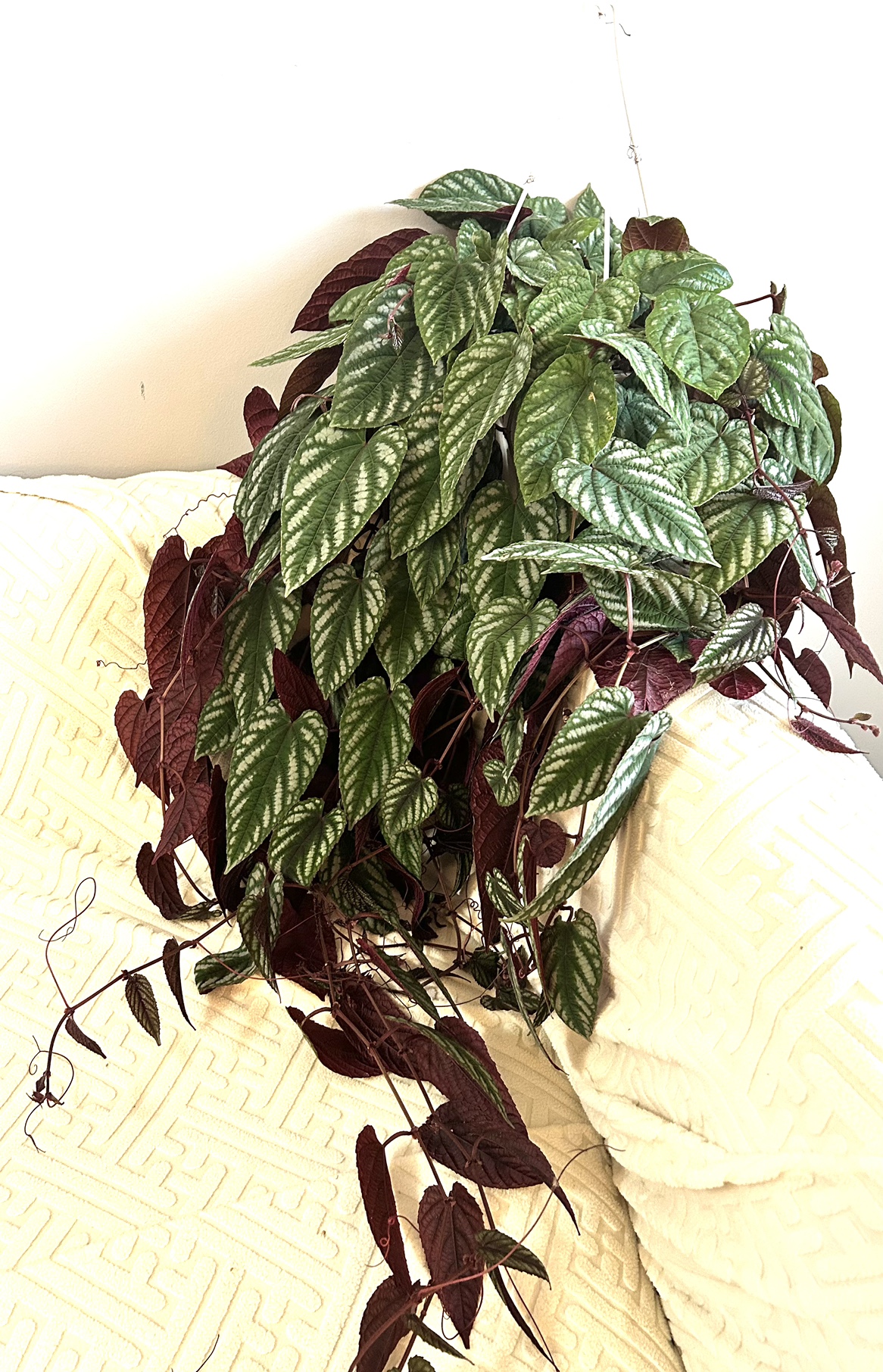 This plant is well established and trailing down from a hanging planter. The leaves are a beautiful silvery green with darker green veins. The vines are maroon.