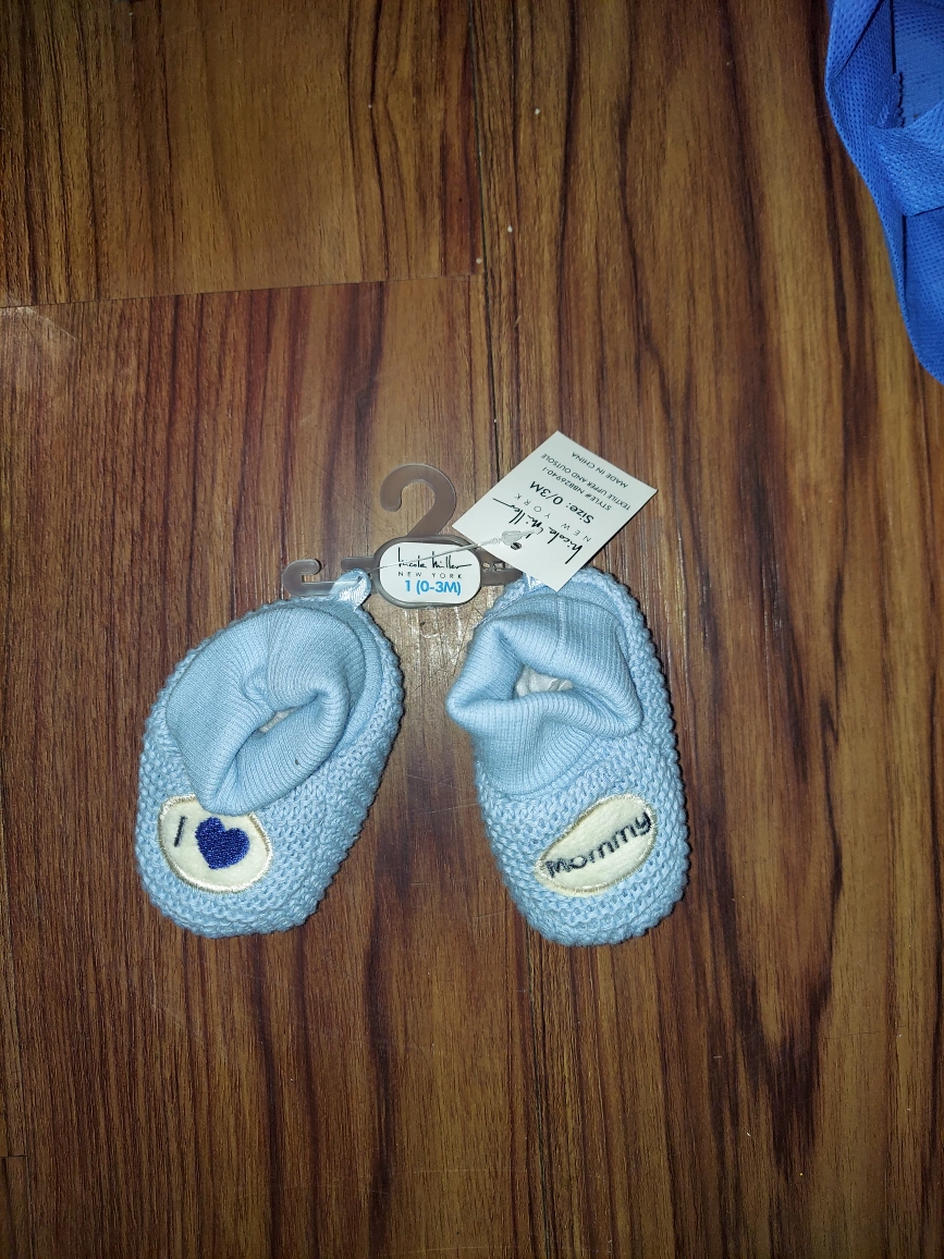 18Blue knitted baby booties with "I Love Mommy" on them. Size 0-3M..