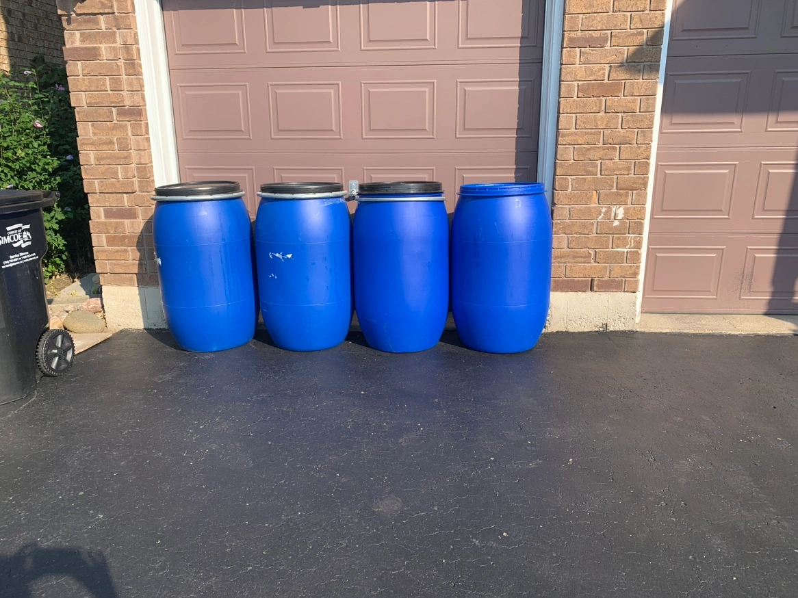 Four large blue plastic barrels used for storage or delivery. Can hold sand, water, salt, etc. and are weather proof. Comes with lids. Buy each barrel for $40 or all 4 for $150.