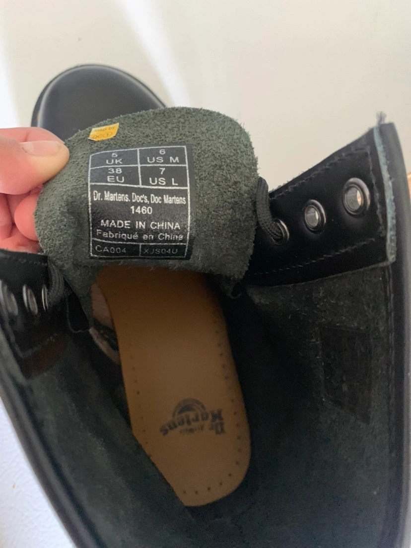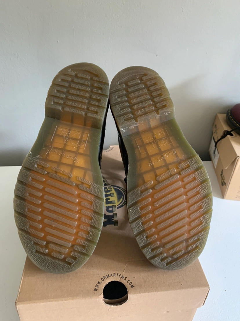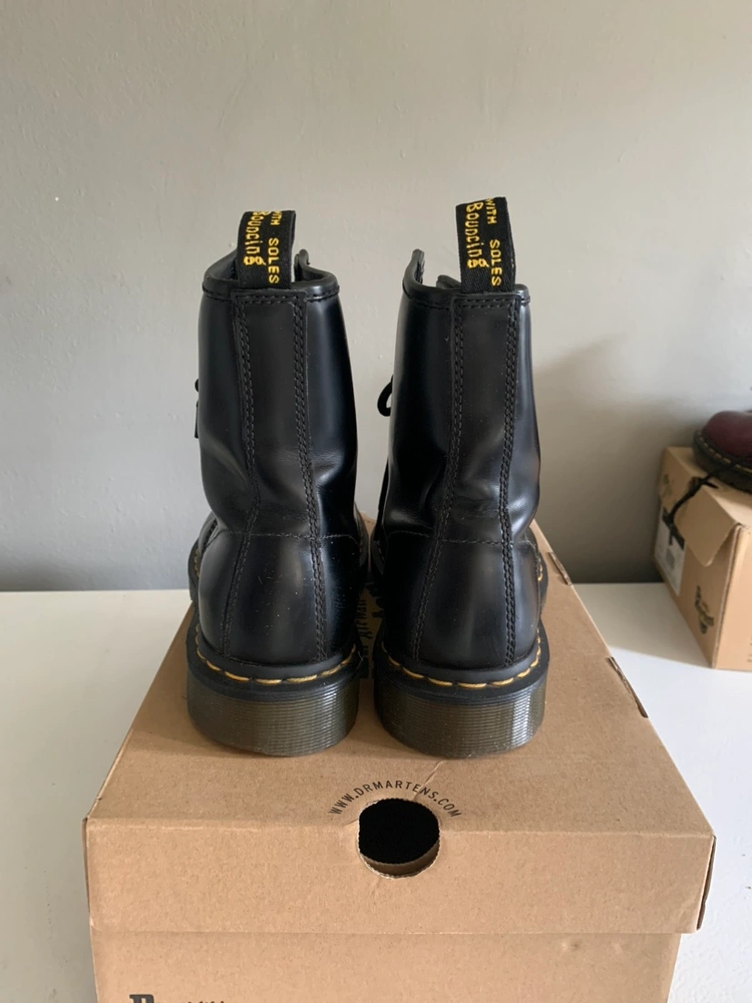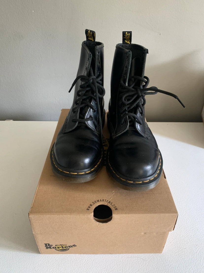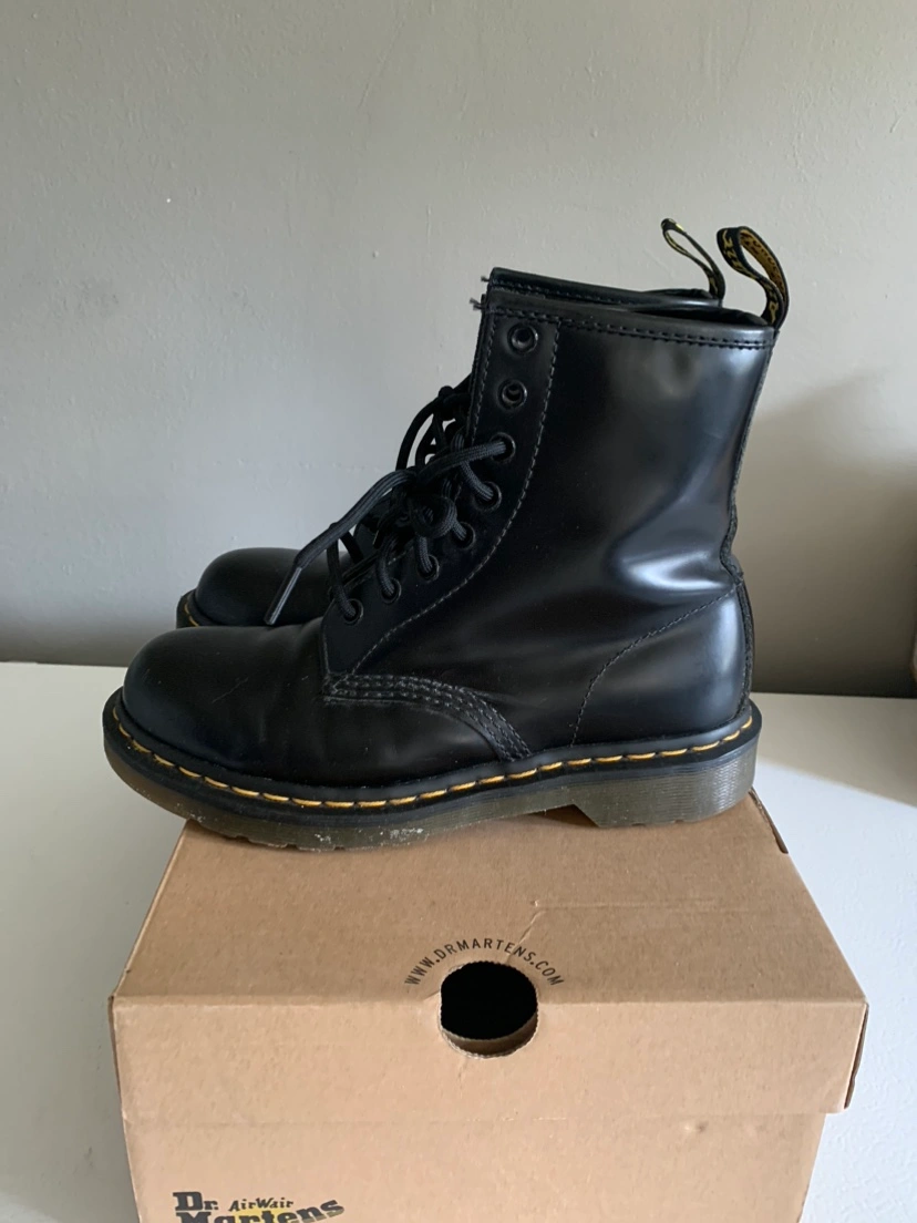 Black leather Dr. Martens 1460 boots. The boots are in good condition. They are a size 6 UK or 7 US. There are some scuff marks on the leather and the soles have signs of wear. The laces are original and in good condition.