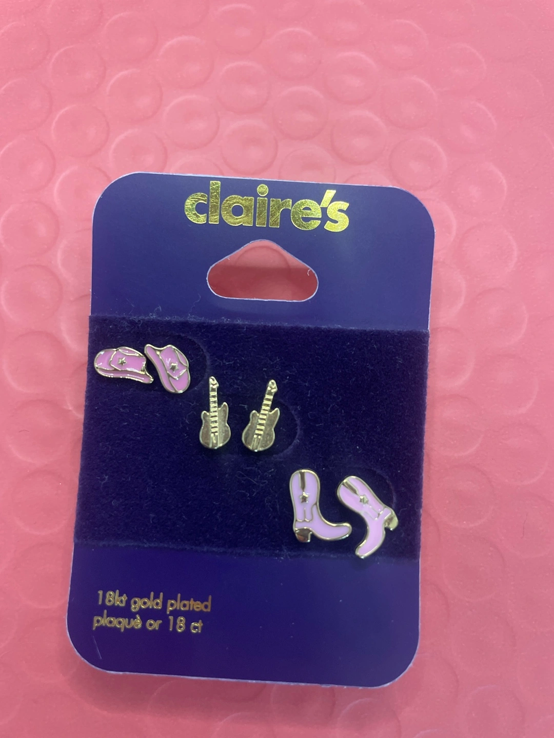 A set of three stud earrings with pink and 18kt gold plating. Features cowboy boots, hats and a guitar. Yeehaw!!ðŸ¤