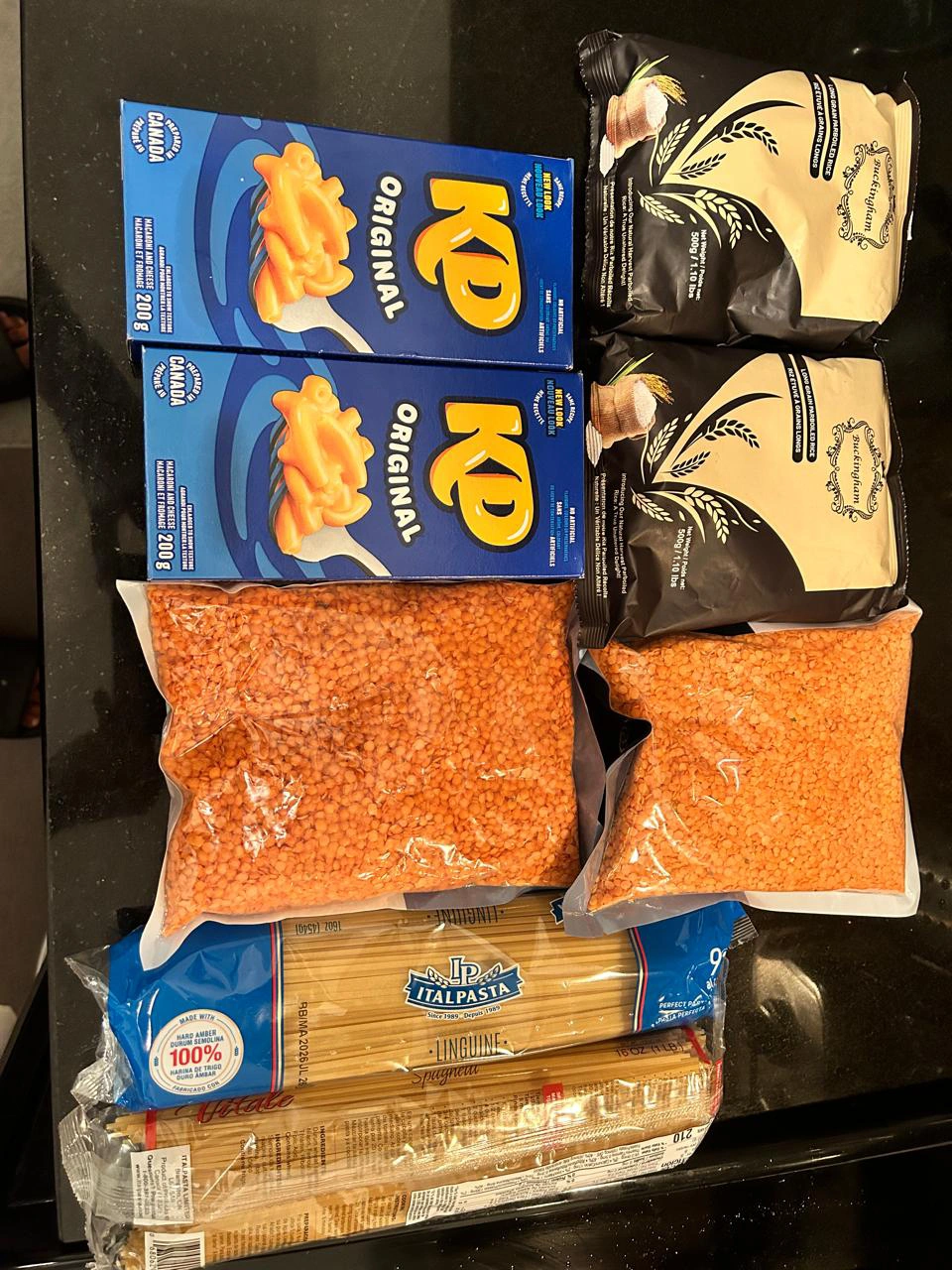 This listing includes two boxes of KD Original Macaroni and Cheese, two bags of red lentils, two bags of Buckingham long grain parboiled rice, and one package of pasta Linguine Spaghetti and 4 packs of noodles which doesn't include in the picture.