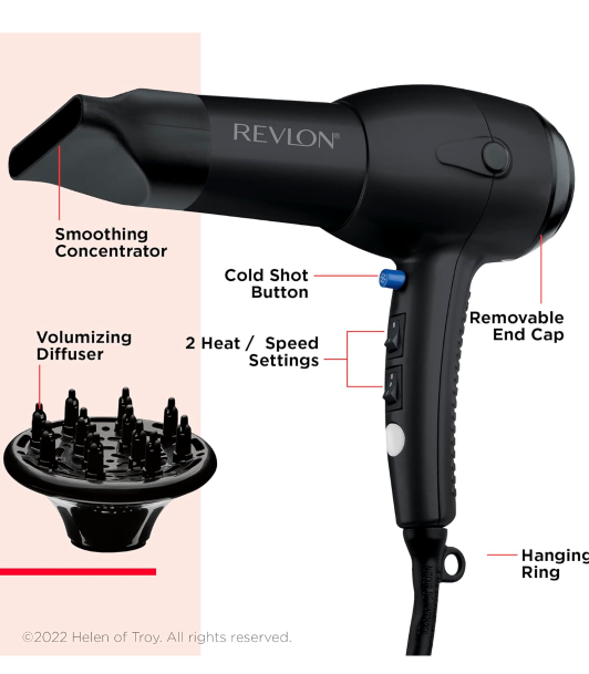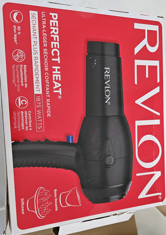Black Revlon Perfect Heat Hair Dryer with two attachments. 1875 Watts. Two heat and speed settings. Includes a concentrator and a volumizing diffuser. Comes with the original box.