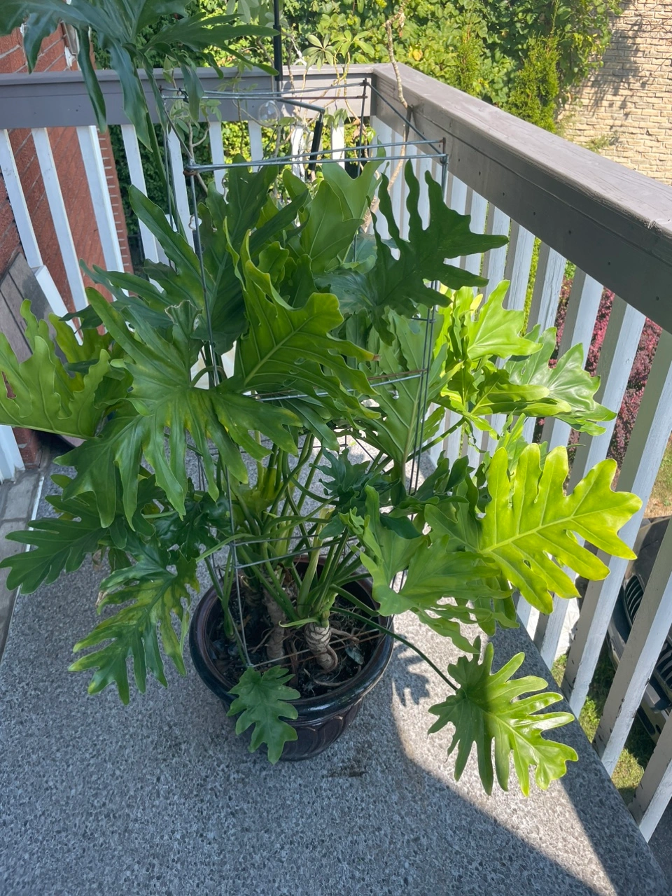 A large, healthy plant in a brown pot. It is currently being supported by a metal trellis in the pot.