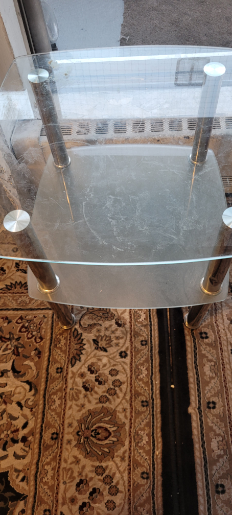 This table is a great way to add some modern style to your living room. It features a glass top and chrome legs. It is in great condition.
