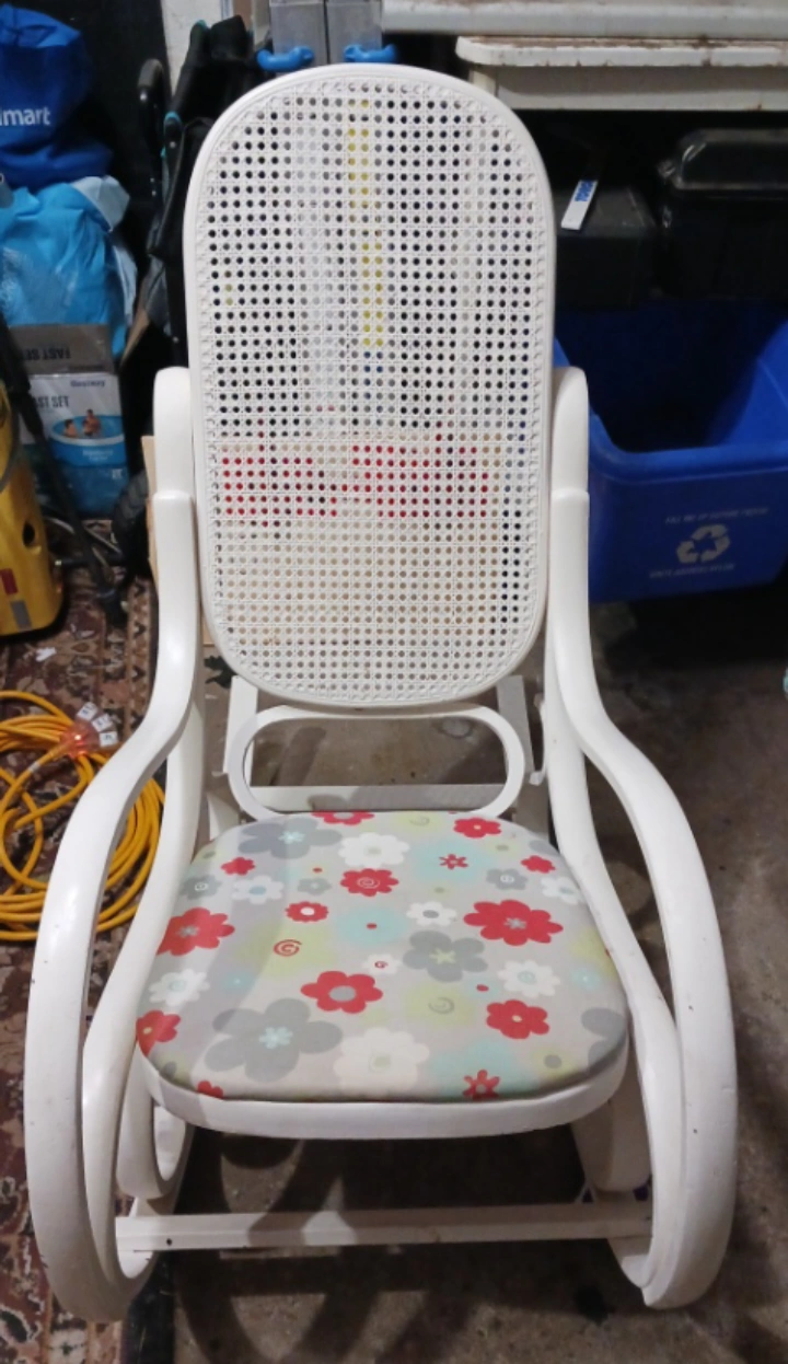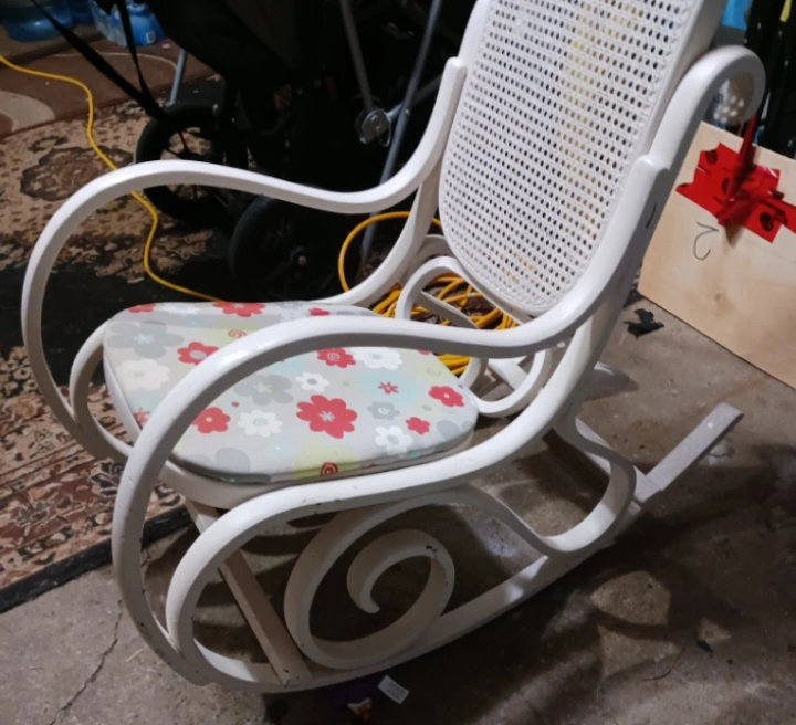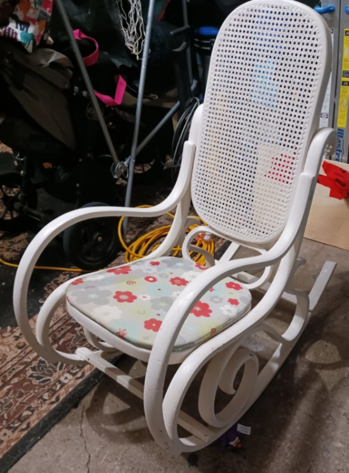 Refinished 5 years ago, could use a new coat of paint, but still in livable looking condition and needs a good wipe. Very strong as I'm a fair sized lady. Just find it unsafe around my baby or wouldn't sell it.