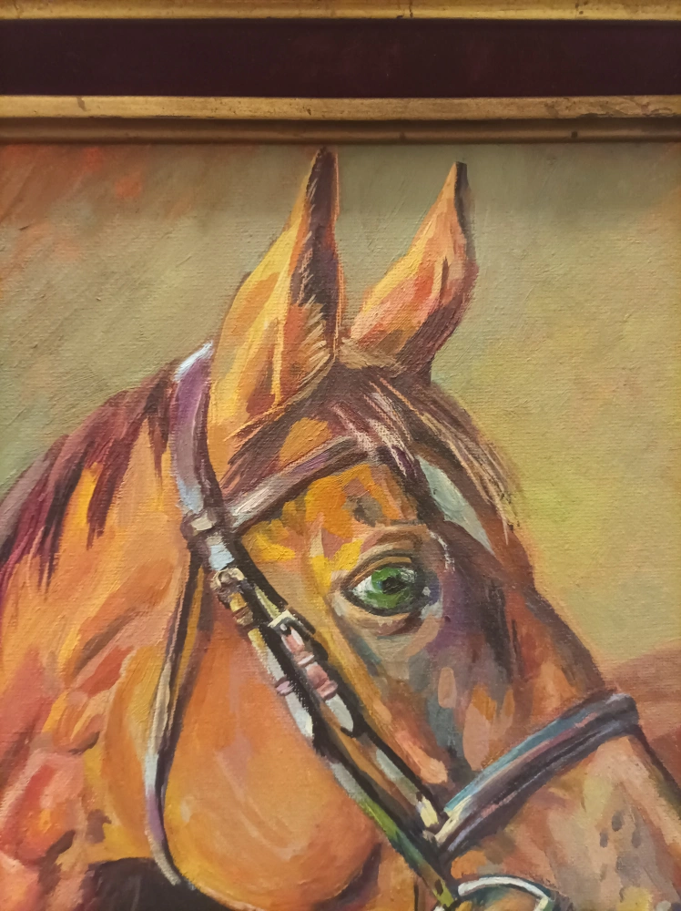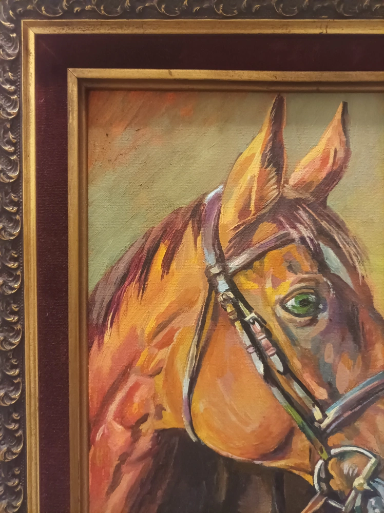 A framed painting of a horse's head. The horse is brown with a green eye and is wearing a bridle. The background is a light yellow.Original oil painting on Canvas.